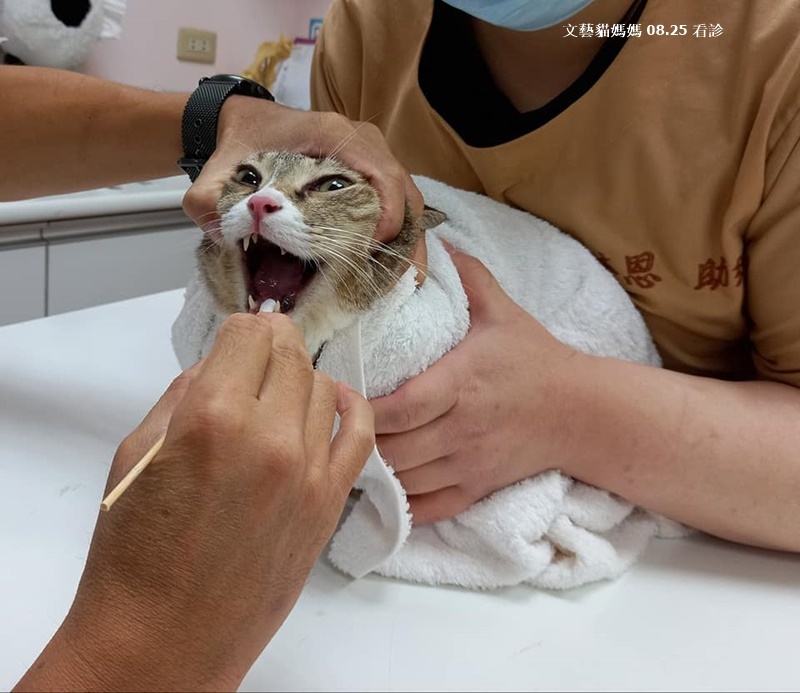 2020年5月,照護員發現文藝貓媽媽的右眼突然腫起及口腔異味嚴重,安排接回台北醫院檢查,眼睛應是受到感染,以點眼藥方式治療,牙齒有牙結石。牙齦發炎,懷疑有齒吸收需要接受牙周治療,血檢結果也確定文藝貓媽媽可接受手術,因此於5月19日進行了牙周手術,除了洗牙,並將狀況不好的7顆牙齒拔除,術後需吃類固醇及抗生素,幸好手術很順利,休養幾日後,文藝貓媽媽的食慾逐漸變好、嘴巴也沒有異味了,術後的幾次回診,口腔情況都有進步,醫師嘗試減低類固醇劑量,但在回診卻發現口腔又變紅,因此需要再吃回較高的類固醇,吃類固醇需追蹤血糖,幸好文藝媽媽的血糖及紅白血球及肝指數都還在正常範圍內,食慾精神也都穩定,需持續回診追蹤直到可完全停藥。