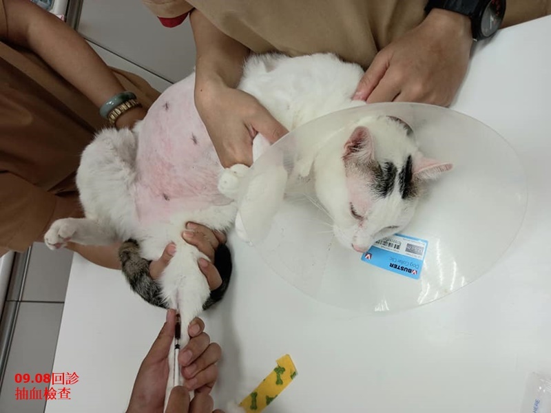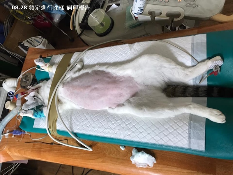 鐵雄今早進行皮膚及淋巴採樣,因鐵雄長期以來一直有腸繫膜淋巴結腫大的情形,又8/11的超音波檢查發現腎臟旁邊淋巴也有腫,並在超音波檢查前剃掉腹部的毛後,發現皮膚有很多紅班,進一步查看,背部皮膚也有紅斑,但鐵雄這期間並無抓癢,林院長認為這樣看來並不像是單純的皮膚過敏,懷疑有淋巴癌的可能,因為淋巴癌有時會影響到淋巴及皮膚,在先以抗組織胺給鐵雄服用一週後未見皮膚紅斑改善,因此決定於今天進行手術採樣送驗及切片病理報告,報告結果約一週至10天可收到。