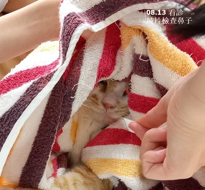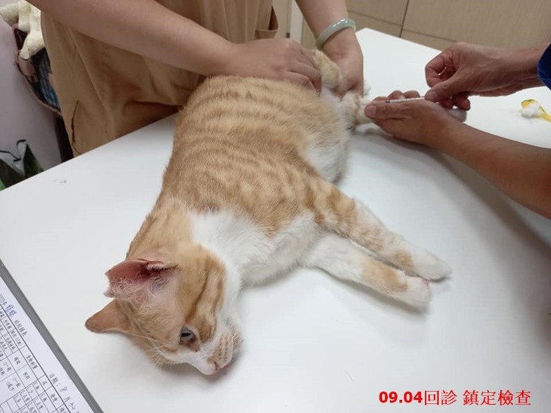 糕糕在協會受到良好照顧,健康狀況越來越好,長胖很多,他的個性很害羞,總是躲在安養之家老大尼董的身後,看診時又非常緊張,得用大毛巾整個包裹住才有辦法看診。