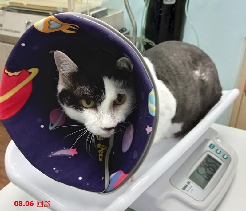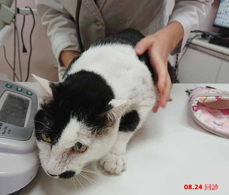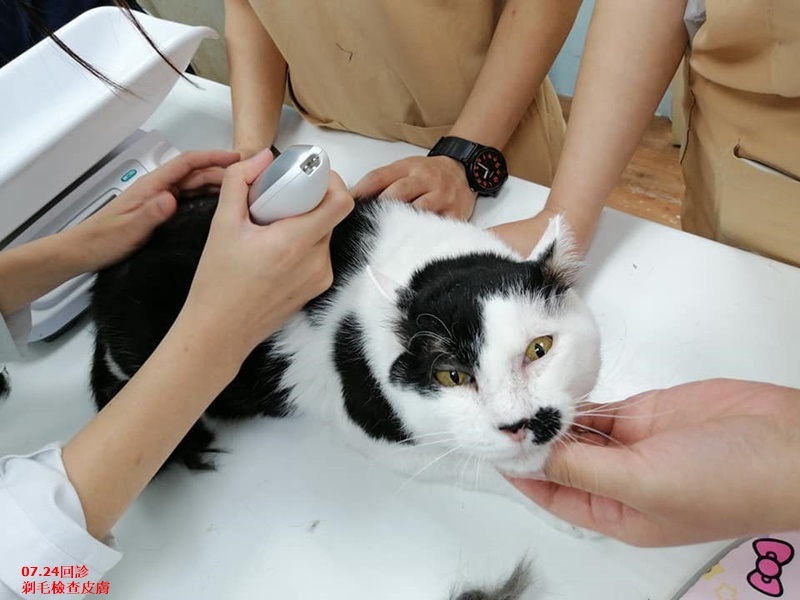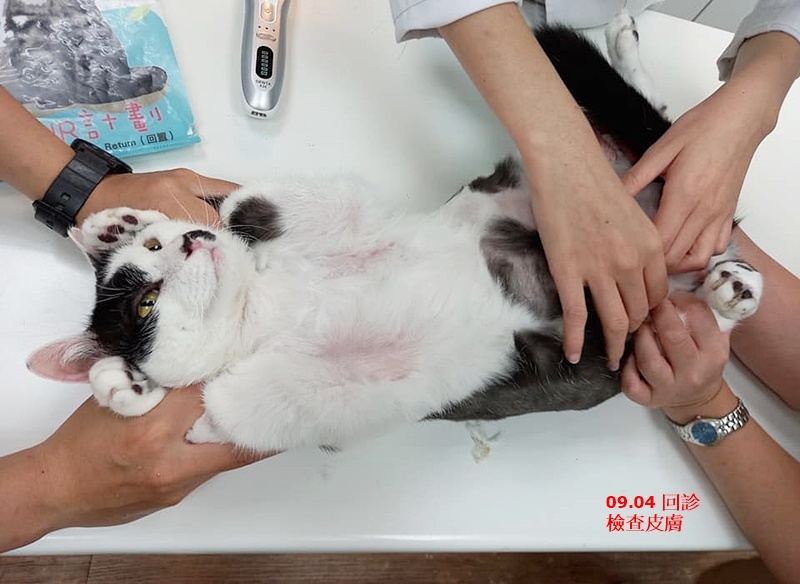 今天無血檢,檢查皮膚用藥後情況,後腳內側患處已好很多,不用再擦藥膏了,但胸口有新患處,醫師將胸口毛剃掉,因戴頭套不便擦藥,所以須吃黴菌藥。