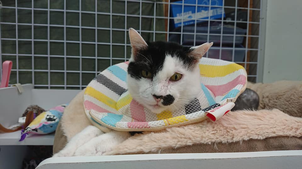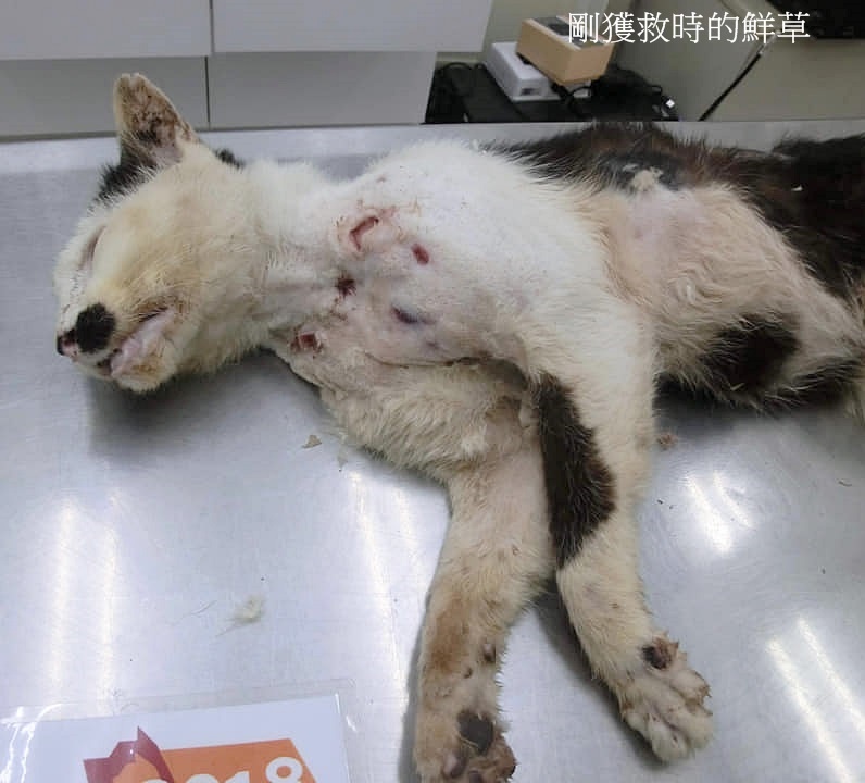原以為是車禍受傷,但麻醉剃毛後發現全身上下怖滿了大小傷口,多處傷口已潰爛化膿,牙齒所剩無幾,口腔紅腫,眼睛也有些霧化情況,住院治療了一個多月,進行血檢、二合一檢驗、完成結紮、洗牙,狀況較為穩定後便接回安養之家。
