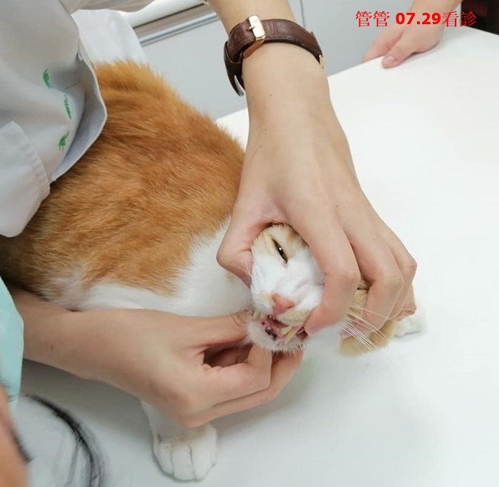 在2018年4月間工作人員發現管管吃飯時發出疼痛叫聲,體重減輕,立即安排就醫檢查,發現有嚴重的口炎,進行手術拔牙將發炎較嚴重的牙齒拔除,但幾個月後食慾再度不佳,血檢的發炎指數仍偏高,因此再進行第二次牙周手術拔牙,同時做採樣以確定口炎是否與腫瘤相關;報告結果確定並非腫瘤引起,而是發炎性質的口炎,為使管管的口炎能夠得到有效的控制,管管在醫師的指導下開始施打干擾素,並須每周回診進行追蹤檢查,再依據檢查結果調整用藥。