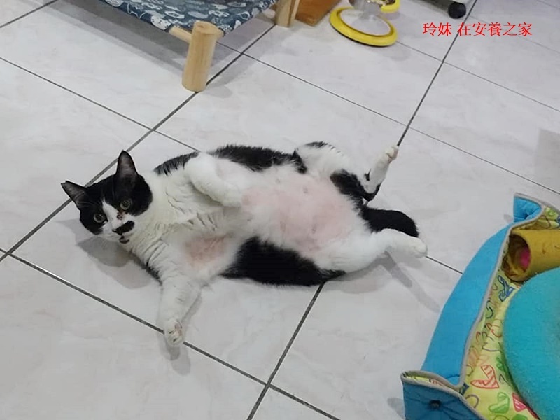 雖然玲妹在安養之家受到細心呵護,環境也非常安心舒適,但她一直無法拋開在收容所那段時間的陰影,所以很容易緊張恐懼,曾因無法順利排尿就診治療一段時間,至今仍是會與人保持一點距離,但還好與其他貓咪相處得很融洽,體型也越來越圓滾滾,當她因人太靠近了又想逃跑,時,就彷彿看到一顆黑白保齡球滾走了。
