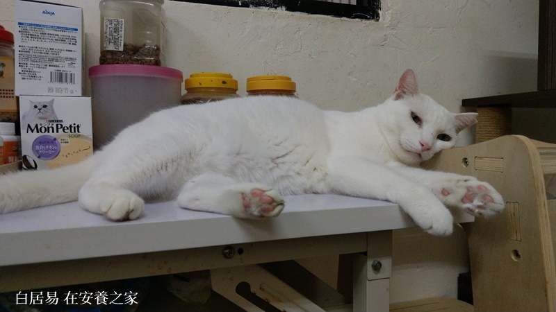 白居易原本是桃園地區民眾餵養的街貓之一,但某日出現壞人對貓群下毒,不幸有好幾隻貓咪中因毒過世了,協會接獲通報,立即前往帶回倖存的白居易及另一隻貓咪。