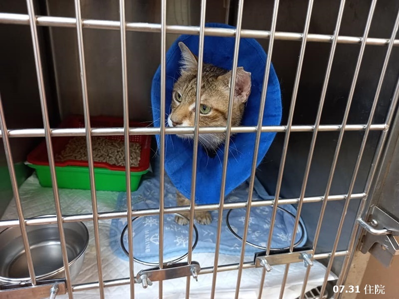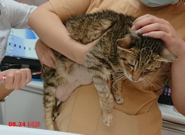 剛開始橡皮擦非常緊張也很兇,但是幾天後開始喵喵叫討飯吃,撒嬌要討摸摸,甚至還會跳到醫生助理身上要抱抱,可能因是愛滋緣故,橡皮擦的傷口恢復速度很慢,住院將近四個月才逐漸穩定,協會便辦理出院帶回安養之家。