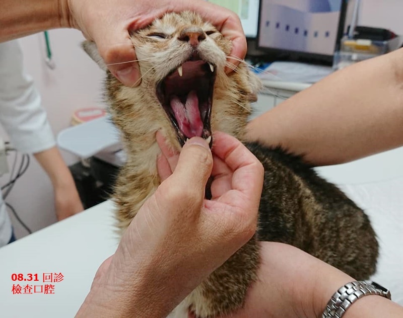 橡皮擦於2019年檢查發現口腔大片紅腫,進行口腔採樣送病理切片報告之後,開始施打干擾素及配合吃類固醇,紅血球指數有時不穩定須打造血針,干擾素的療程須配合醫師指示回診記錄口腔情況、定期血檢查看指數變化以調整用藥,照護員仔細觀察精神食慾並記錄體重,施打干擾素一段時間口腔有些改善,但還未到完全好的程度,一直持續回診追蹤。