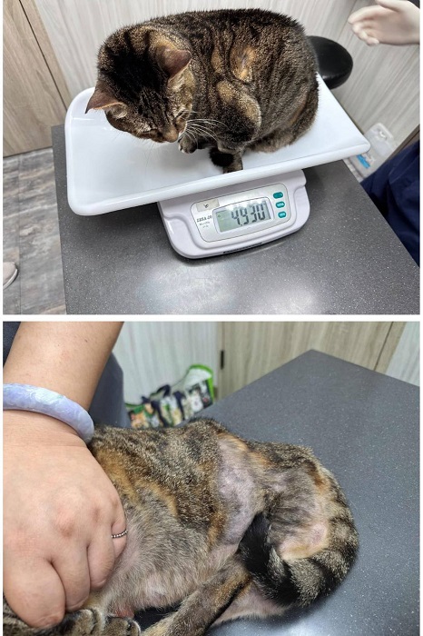 於2025年10月發現乖妹右後腿有不規則腫塊因此於2025年10月28日進行回診查看,硬塊太硬無法取出檢體其直徑1.2公分。研判可能是長期摩擦產生的硬塊,先觀察1~2個月有變大再做切除化驗,若沒變大就先不處置。同時乖妹的體重下降很多要注意吃飯狀況,先開消炎藥吃2到3周再回報醫院。並於同年11月10日回報醫院需繼續戴頭套及吃藥。