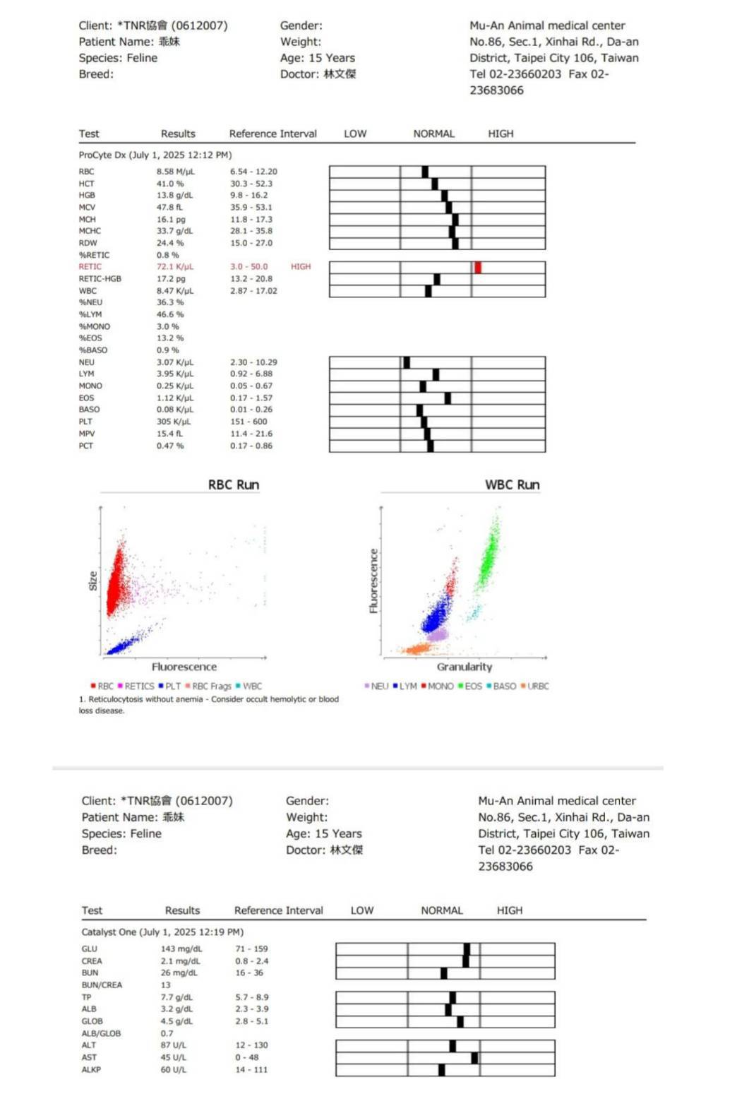 近期於2022年9月5日至沐恩醫院回診追蹤,紅白血球、肝腎都正常,但發炎指數升高,營養蛋白及A/G比,還好體重沒有異常,11月1日再度後回診追蹤,A/G比及營養指數都有回升,體重也再增加,身體的狀況有進步,但是牙齒的狀況變差,建議安排牙周手術。