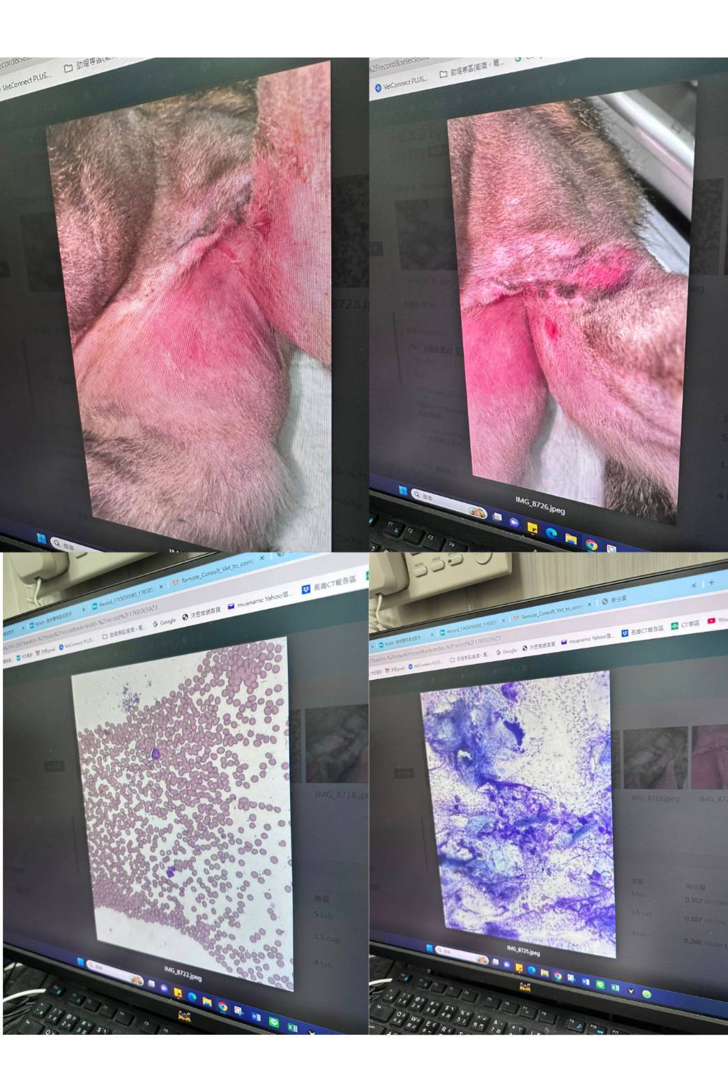 2026年一月因乖妹左後腿胯下皮膚反覆感染滲黏液,安排1月14日回診檢查。醫師把周圍毛剃乾淨並清潔,今天一樣有黏液。進行抹片檢查後,嗜伊紅性球少,就不需服用類固醇。是常見的濕疹,但因細菌很多,抗生素要吃兩週。