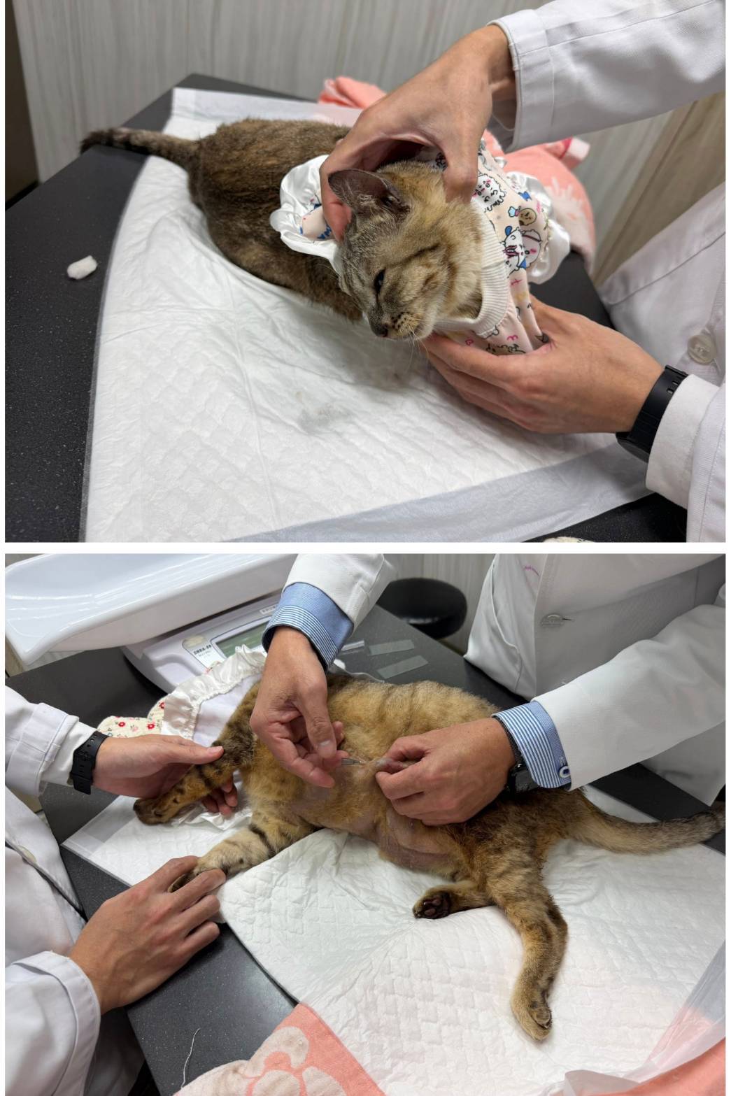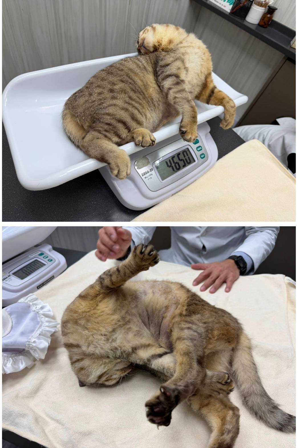 近期於2025年12月10日回診,醫生表示血檢正常但體重增重太多,需減少灌食量,同時因右耳長期往下所以耳藥無法有效停留,所以仍有酵母菌問題需加強耳劑量,一日仍需維持2次清潔。身上黴菌已有改善,僅有尾巴尖端有黴菌已於現場剃毛處理。此次因體重增加所以會再做藥物調整。