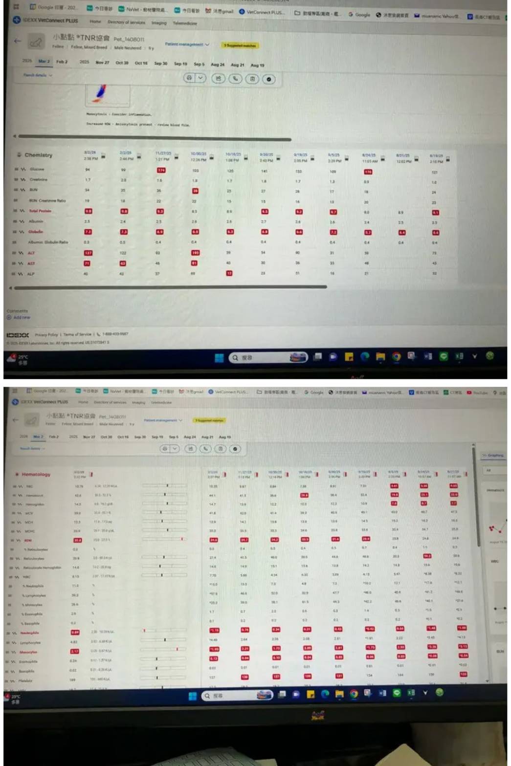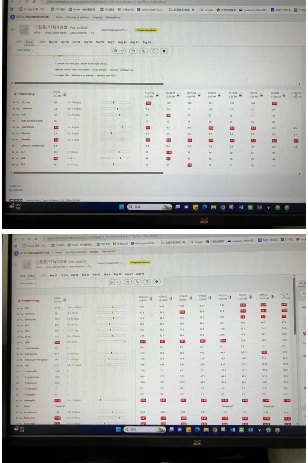 2025年10月16日於沐恩看診,因病毒感染長期無法抑制,所以耳朵及嘴巴總是會持續紅腫,需加強清潔保持乾淨。紅血球與球蛋白皆超出標準範圍,同時也須注意精神食慾狀況,若變差則需要儘速與醫院連繫回診。