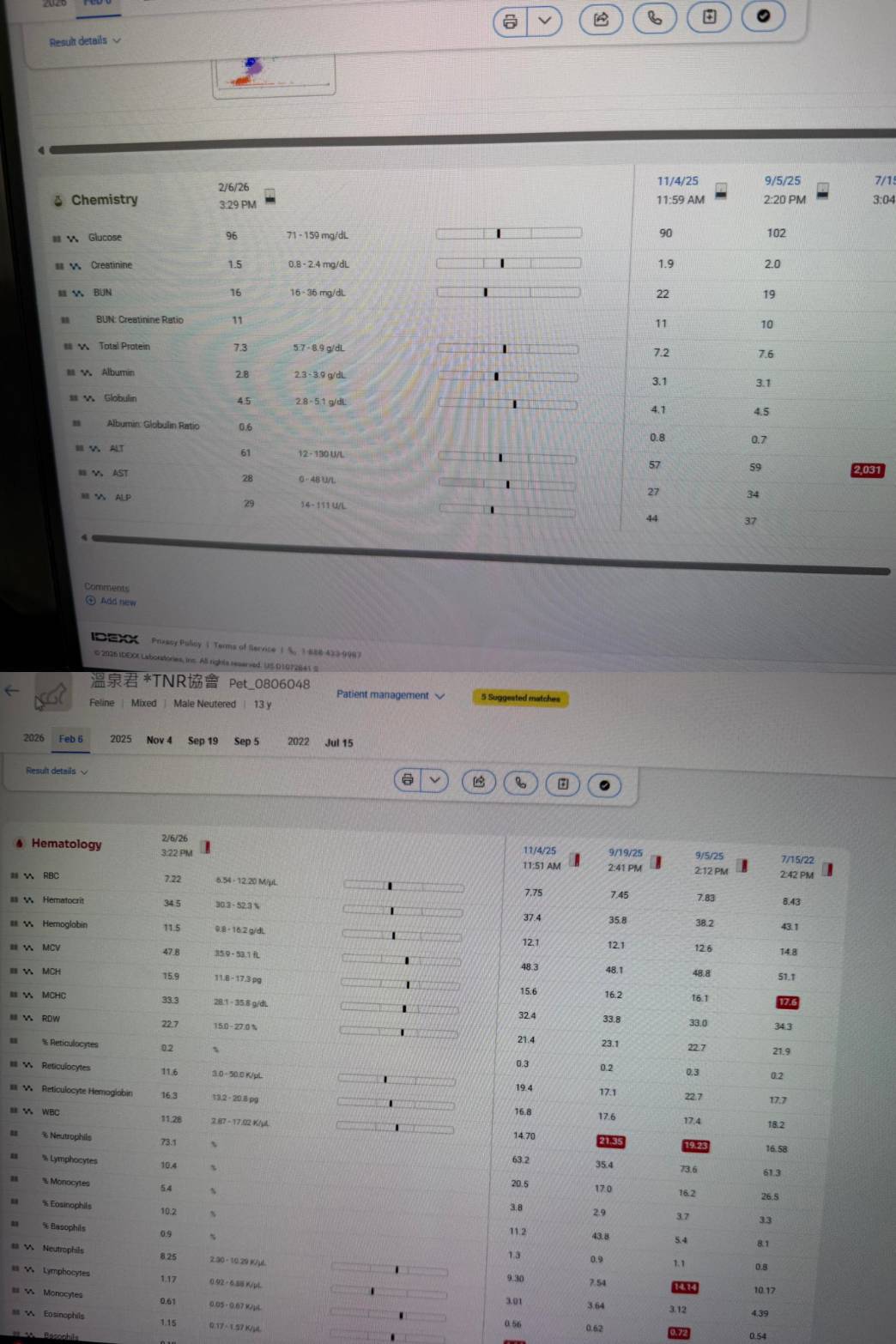近期於2025年11月4日回診,因皮膚也感染黴菌而持續用藥,皮膚須持續做刷洗,並務必擦拭乾淨保持乾燥。血檢指數一切正常用藥也繼續維持。於2025年11月30日持續取藥治療。2026年2月6日因溫泉君連日嘔吐多次且食慾不振,因此於沐恩醫院就診,血檢結果正常體溫也正常,先行在醫院施打皮下及止吐。並先餵食胃乳三天,其他用藥照舊。若三日後無繼續嘔吐即可停用胃乳。