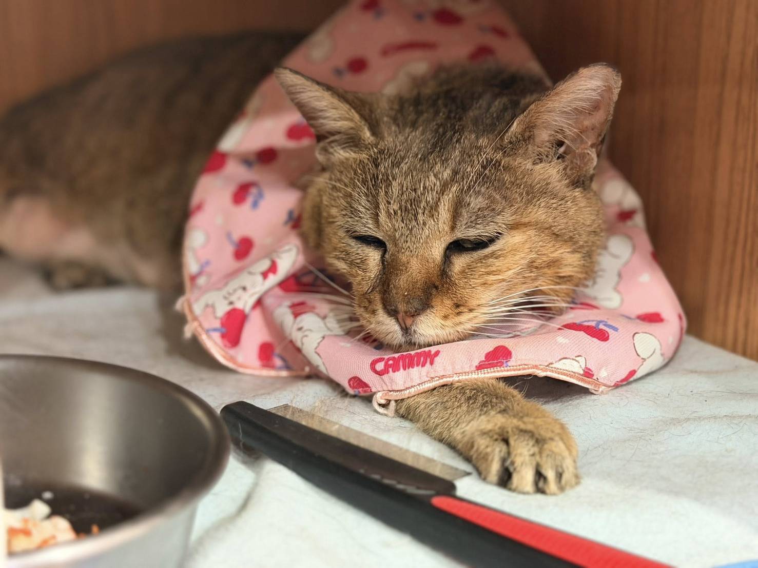 2025年11月25日回診,此次體重增加突然變胖太多,醫師擔心有糖尿病徵兆,但上回有驗過果糖胺是正常,所以這次沒有驗,下次回診如果體重上升會再評估加驗。有與醫師討論,仁愛這幾週食慾並沒有特別變很好,但還是會自己主動吃,因此建議先從照護員灌食飼料泥減量開始。有稍微貧血但還不需要打造血針先吃倍補血保養。淋巴結有稍微變大,但在預期範圍。黴菌患處也好很多。