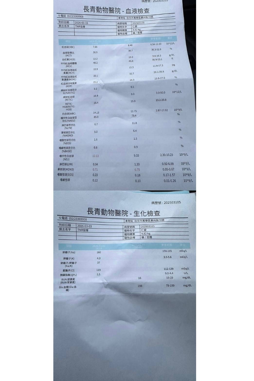 近期11月因仁愛出現黃鼻涕狀況,因此提前於2025年11月25日沐恩回診,血檢發現有些貧血但還無須施打造血針,先吃倍補血,但此次發現血液中有很多油脂擔心回有糖尿病症狀,建議先減量灌食的飼料泥。淋巴結有稍微變大但還在可預期範圍內,皮膚黴菌狀況也有好轉可持續保持清潔。