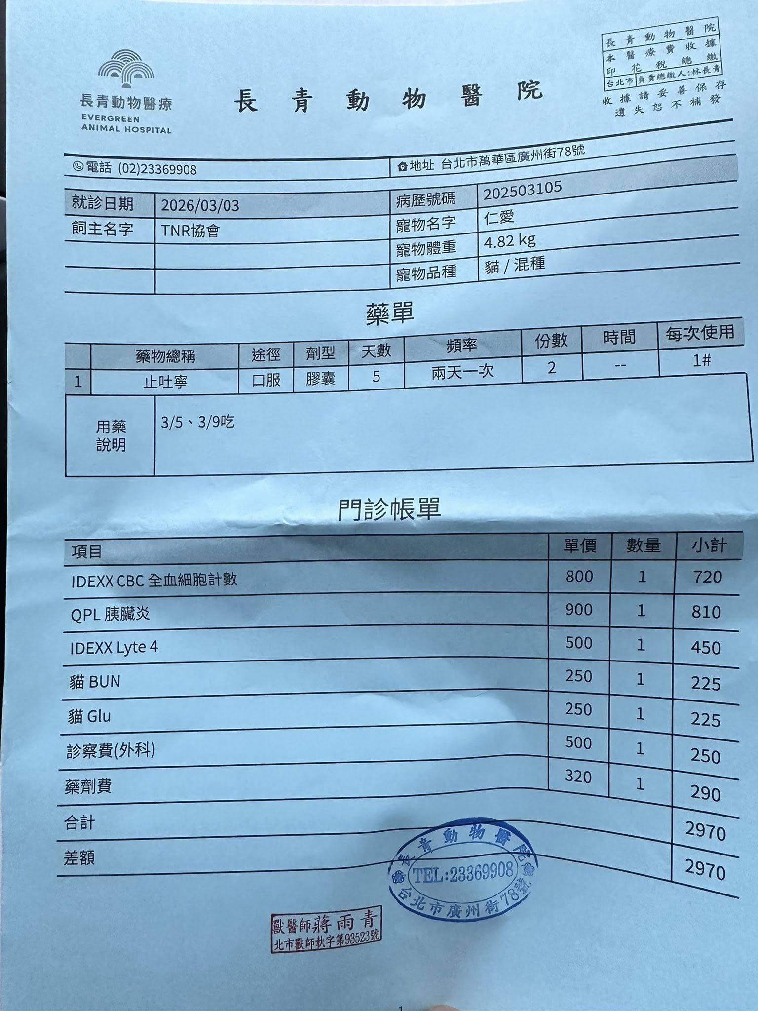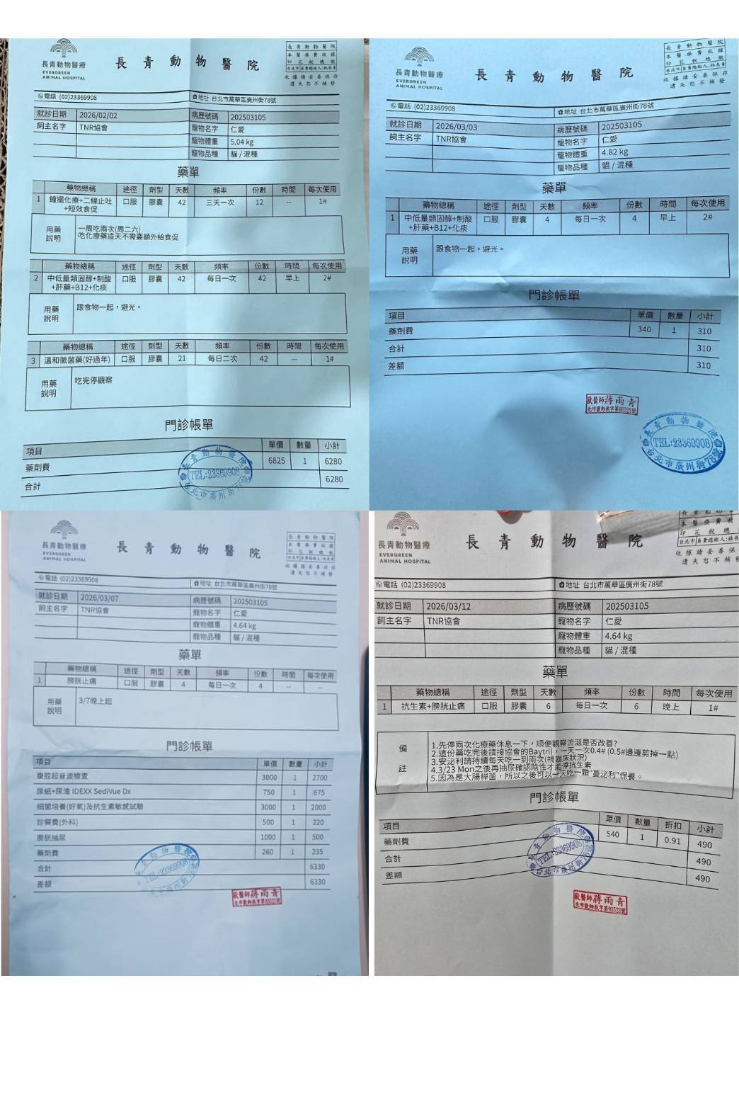 目前比較偏向懷疑是腸胃或食道可能有腫塊,或是胃潰瘍、食道灼傷的可能。都需要麻醉做內視鏡才能確認。醫師擔心仁愛口水流太多,且仁愛喝水量也少,因此提高10ML的皮下輸液。目前做法先加開止吐寧,看是否有改善,近期需每天回報是否有流口水 (有無明顯滴口水或是嘴邊濕濕)。無改善的話,再與醫師討論後續治療方針。本筆醫助是仁愛於2026年2月2日至2026年3月12日間在長青醫院看診化療的費用,包含血檢,細菌檢測及用藥等。