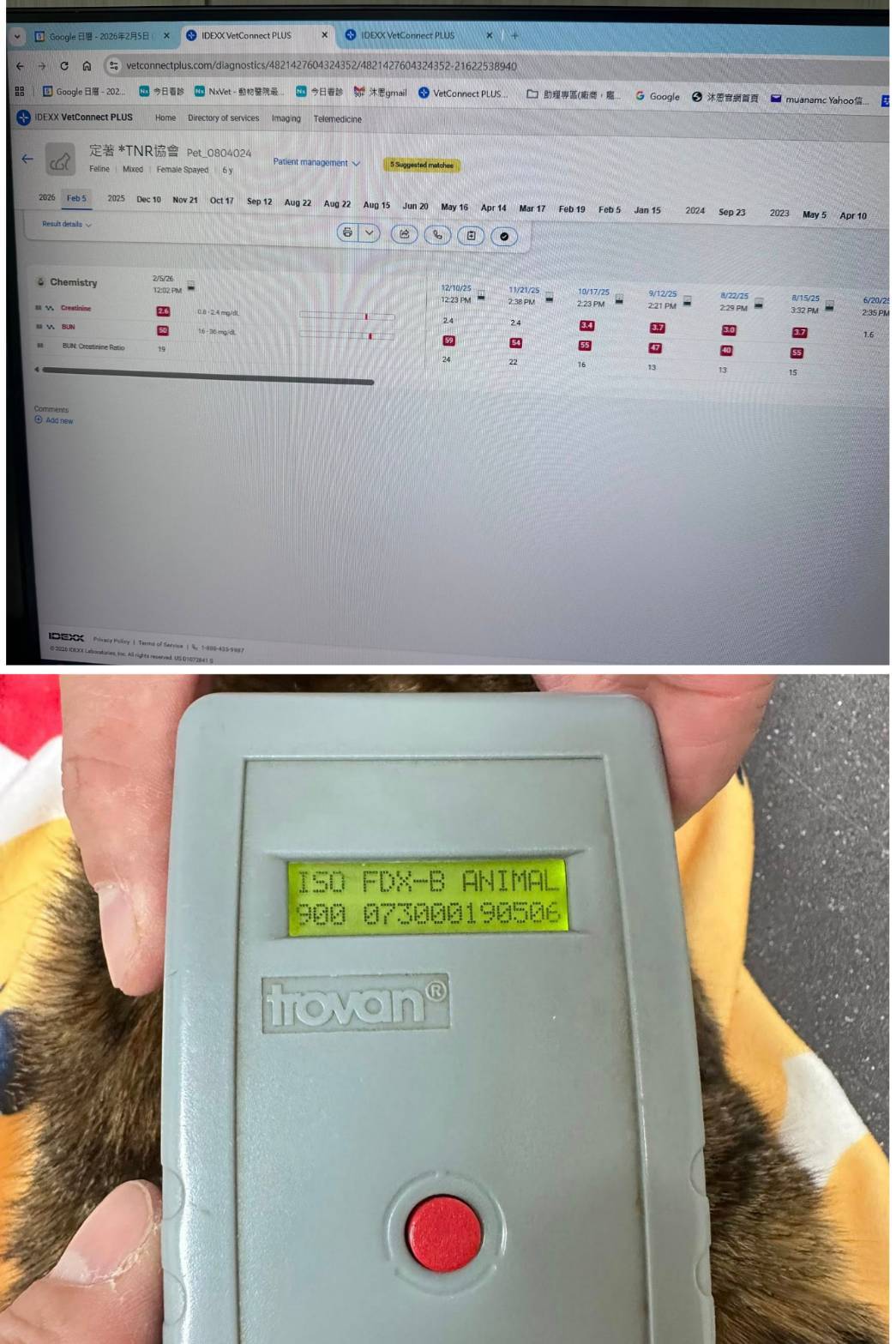 但定著在2025年3月初連續幾日嘔吐,回報沐恩後提前回診,血檢指數都在正常值,但有些脫水,要打抗生素及打皮下輸液,近期於2025年4月14日回診,呼吸道症狀不明顯、血檢大致持平,造血針可再減劑量,體重回升,整體檢查結果還不錯,可以延長回診時間了。