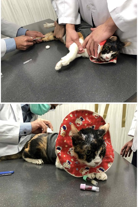 2025年3月25日花嬸突然沒有像往常一樣,拿掉頭套後就想舔,精神不好,頭套裡有嘔吐物,還有蹲便盆但沒有尿便,詢問沐恩後臨時回診,體溫稍微高一點,血檢結果沒有胰臟炎,但白血球升高了,X光檢查胸腹腔沒有發現異常,抽尿檢驗沒有發現細菌的感染情形,就先以腸胃炎治療,打皮下輸液及制酸止吐針劑,看診回到安養之家後,花嬸可能打過針有較為舒服些,有立刻吃飯,也沒有再嘔吐或異常的蹲砂盆行為,2025年4月2日回診追蹤,白血球已經降到正常值了,體重有維持,表示腸胃炎的問題有得到改善,只是血糖升高較多,需要多留意有無異常的多渴多尿。