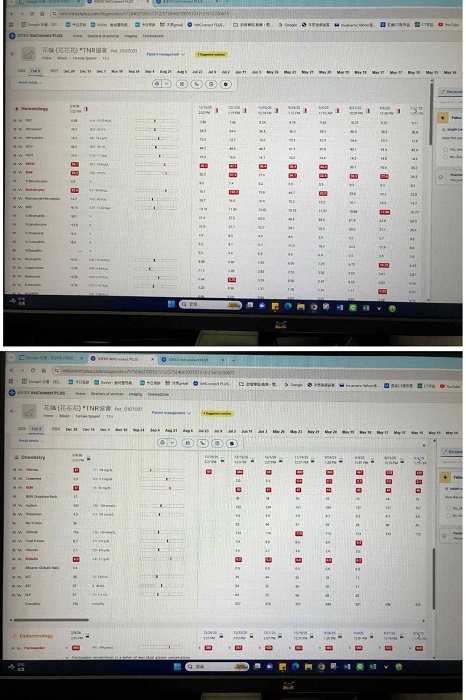 2025年4月21日花嬸又連續嘔吐提前回診,胰臟炎陰性、白血球升高但仍在正常值內,較異常的是血糖指數升高多,雖然花嬸每次看診都很生氣會讓血糖高,但這次升高的幅度較大,擔心有變成糖尿病的疑慮,之後要多留意,至於嘔吐的相關異常並沒有發現,就先給胃乳,至目前花嬸沒有再出現嘔吐,食慾精神都正常,照護員每天仔細觀察她的喝水排尿情形並未發現異常。
