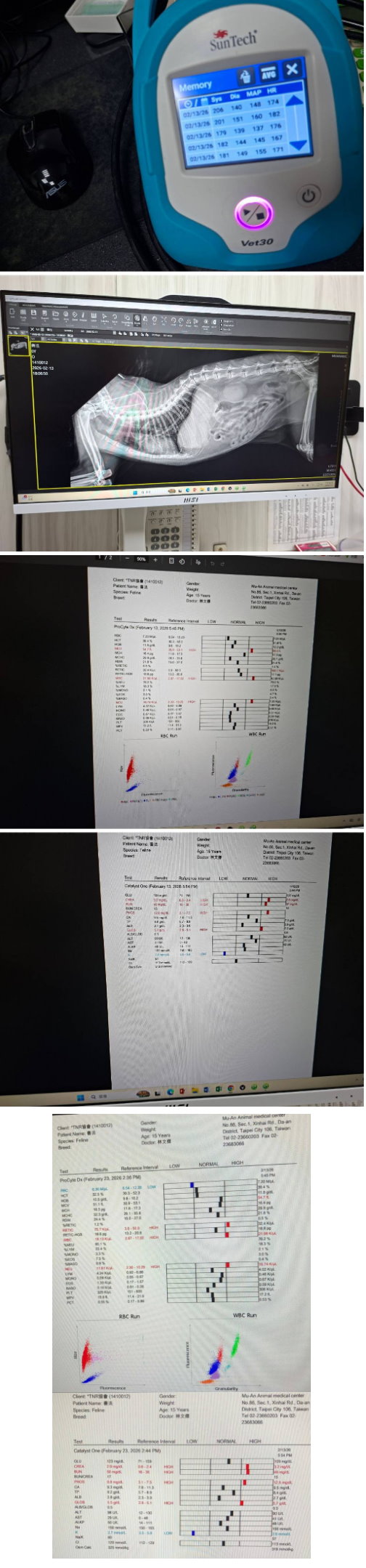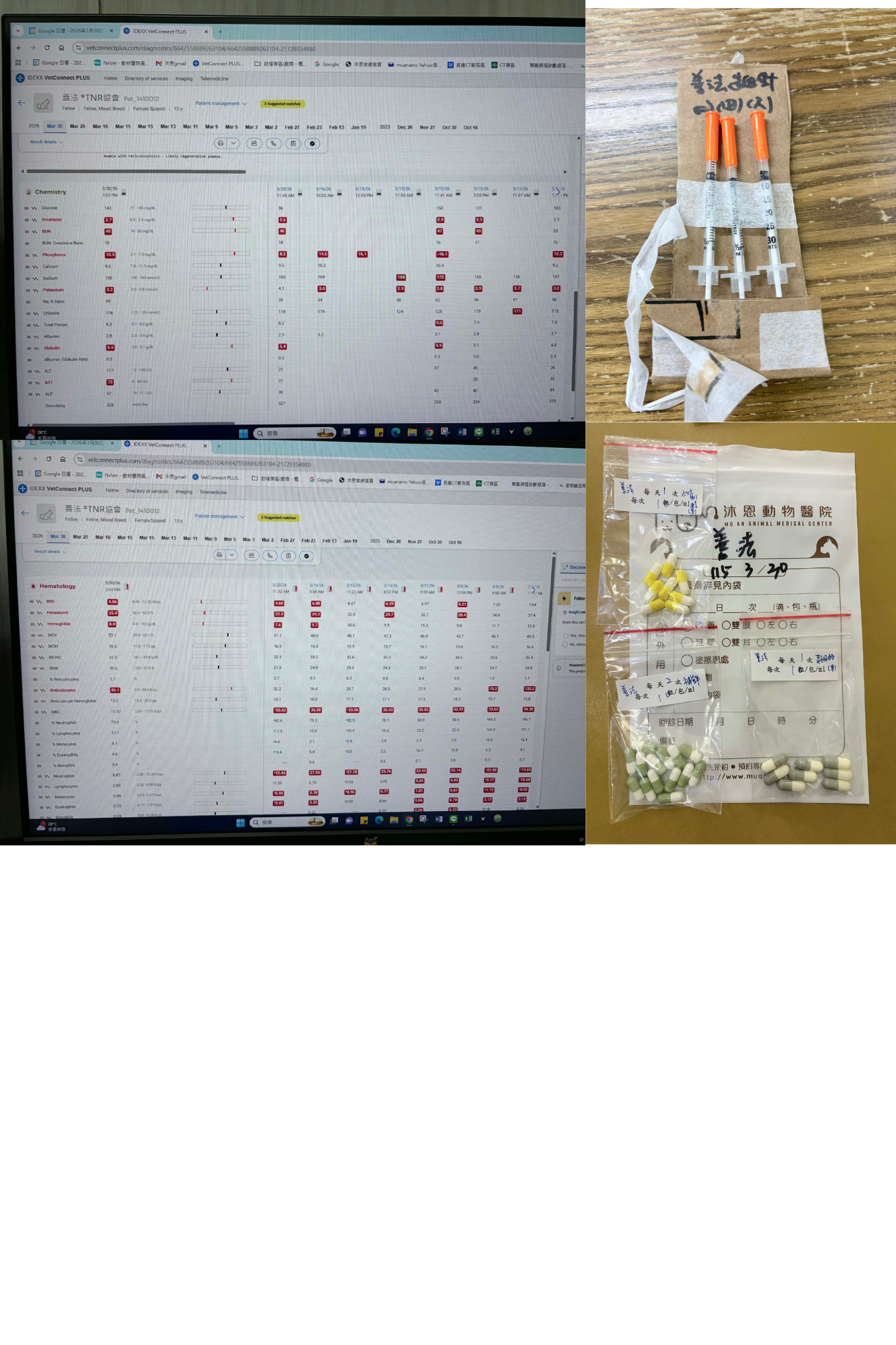 2025年12月26日於沐恩醫院回診,此次醫師協助幫忙剪指甲。其他指數皆超出於標準範圍,尤其磷離子升高到9.5,需加吃腎利磷,因過高會較難維持腎功能。後因善法連日不吃飯,且分別有吐乾飼料和黃水,因此安排2026年1月19日就醫檢查。觸診沒有異常。體溫也正常。先開立止吐及針制酸劑針,同時須施打皮下每天一次,每次150ml,食欲進步改打100ml,食慾恢復正常可停。