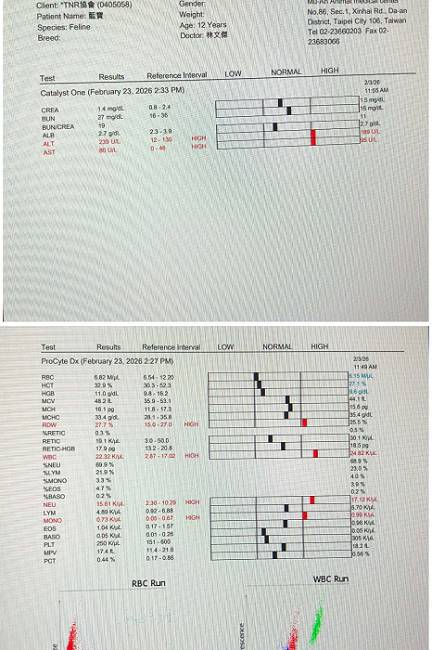2025年12月26日於沐恩回診,血檢部分 白血球及肝指數皆高於正常值須注意,但因目前腎指數正常所以先暫不開立抗生素治療。一月中旬左右,因藍寶持續嘔吐不斷,且有腹瀉脫水現象,於1月26日沐恩看診,血檢結果肝指數上升、超音波顯示淋巴結腫脹嚴重,於是立即安排當下住院觀察,院長表示懷疑是淋巴腺腫瘤,考慮年後安排手術採樣,確定病因。後於2月2日住院期間排便已恢復正常,在2月3日安排出院,須持續用藥及施打皮下,同時飲食部分須將飼料改為MFLD27以及固定罐頭種類,不可給其他食物及零食。