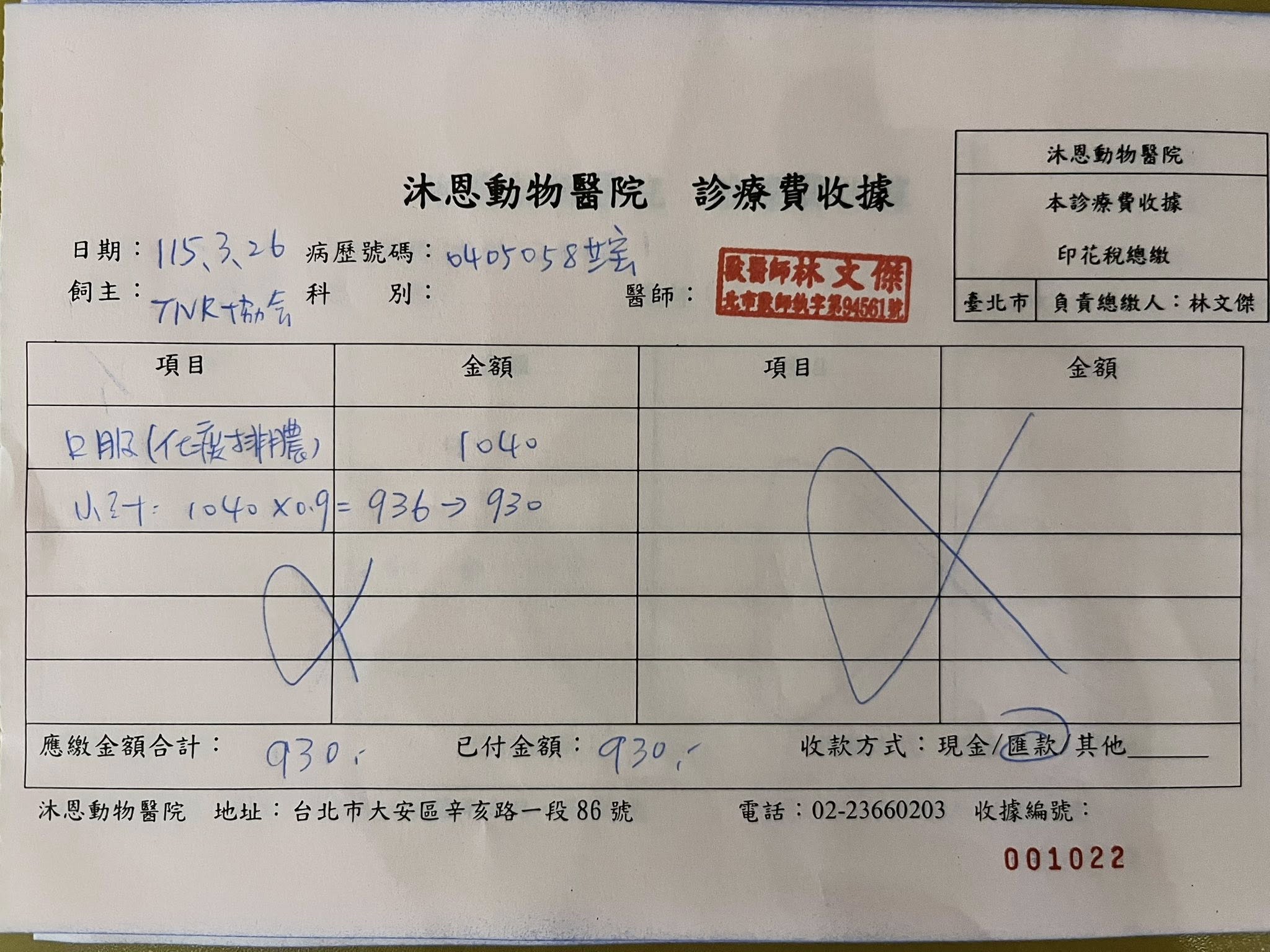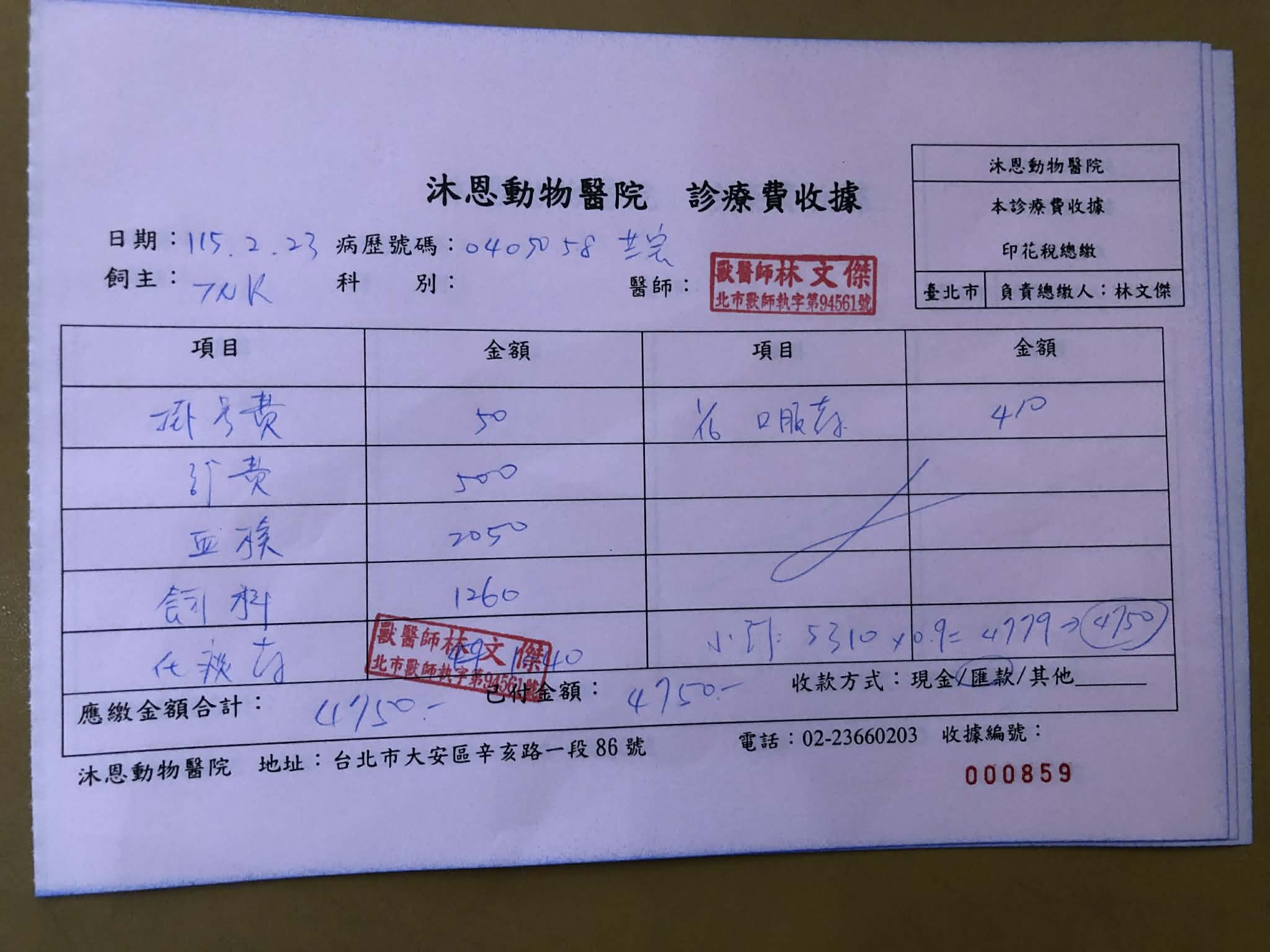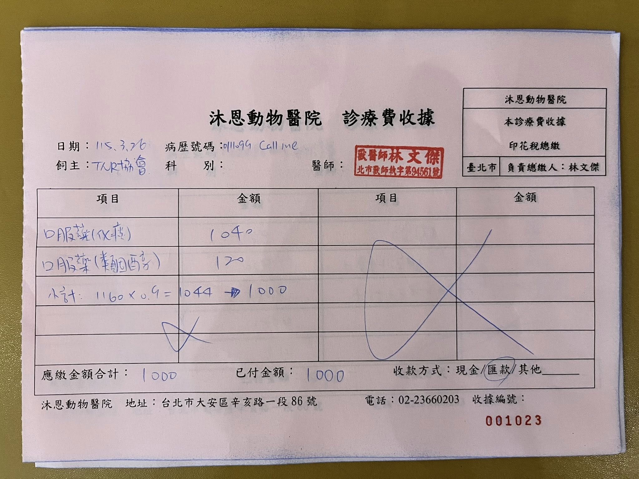 這兩週較常有嘔吐的狀況,醫師說吐完還是有吃飯就沒問題,嘔吐可能和淋巴結腫大有關係。因此食物需要繼續固定,不可給予其他食物零食。本筆醫助是2026年2月23日於沐恩醫院的費用,包含看診及用藥。