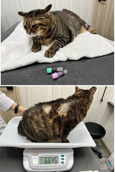 近期於2025年7月4日回診,體重持續增加,血檢結果除了免疫球蛋白上升,其他指數都在正常值,後腳的小瘤大小也沒有變化,鼻涕淚眼情況還好,整體檢查結果還算穩定,抗生素再吃兩個月就可停藥,體重增加很多,食慾促進劑要減量,醫師表示每週體重測量連續兩週都增加,就要先停吃食慾促進劑並回報,無異常可延長為2個月再回診。