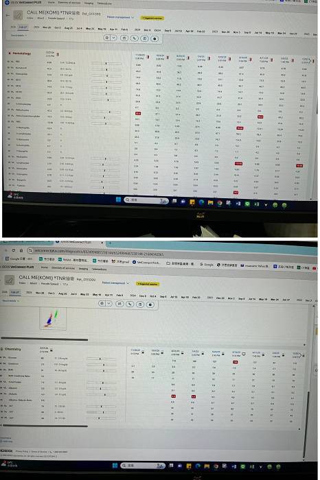 2024年7月12日回診,有帶血濃鼻涕,可能原有的四環素抗生素吃一段時間了已無足夠效果,就先停藥另作鼻涕採樣送細菌培養,看報告結果再選擇有效的抗生素,皮膚檢查,背部右後側及右腿各有一顆小纖維瘤,大小持平、無異常變化,血檢結果,除免疫球蛋白因呼吸道問題仍稍微高於正常值之外,其他指數大致正常持平,整體血檢穩定,可二個月再回診,期間取藥即可。