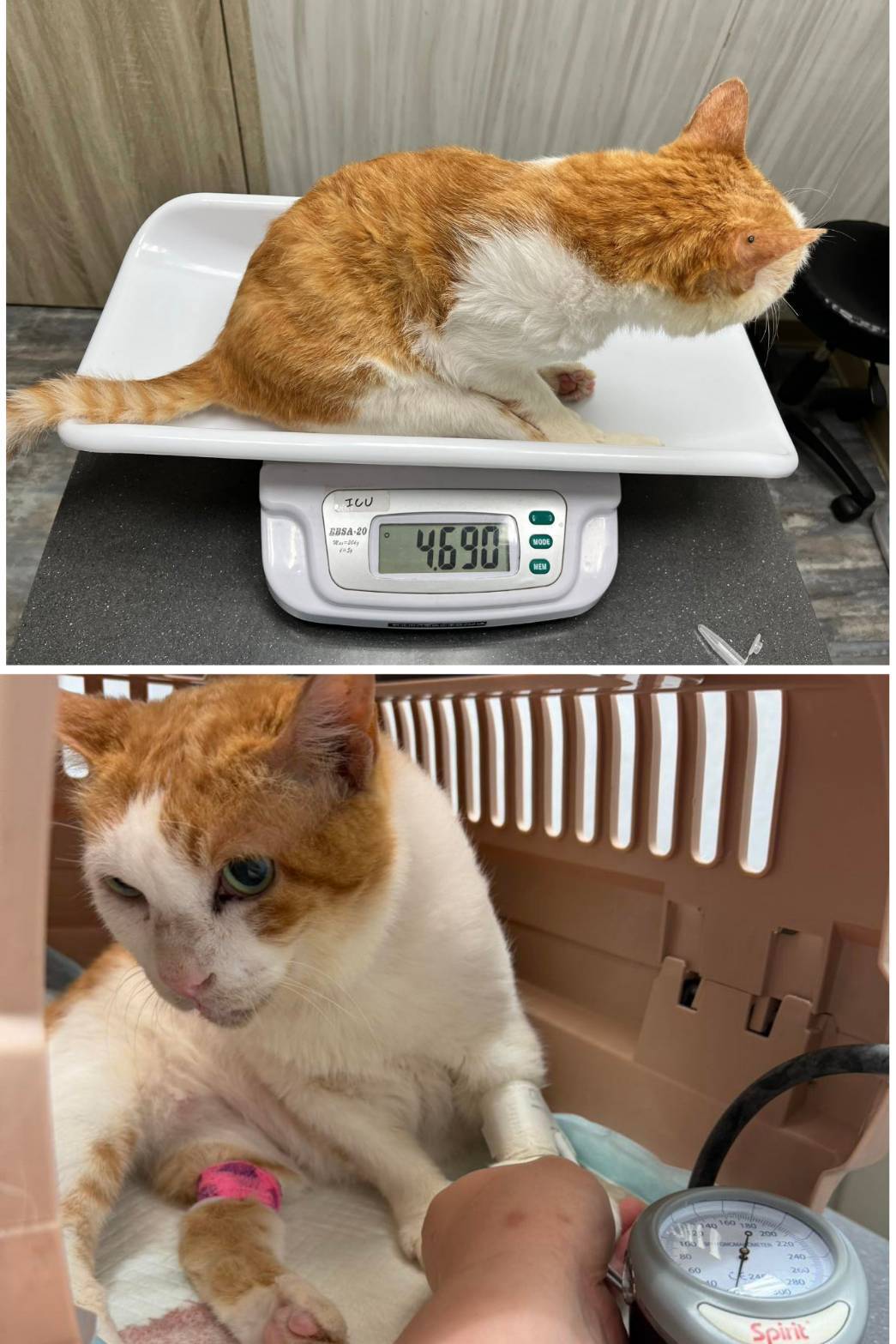 後於2026年2月16日過年期間,因Lucky血尿不止因此緊急於大安動物醫院急診,醫生表示因為外力的因素,也可能因為感染而造成但因為過年期間尿液無法送檢,血檢結果白血球較高,可能是體內的發炎反應,血壓正常、體溫過低需要注意保溫,呼吸較喘,吸氧會比較舒服。加開抗生素跟嗎啡滴劑。超音波顯示膀胱並不會很大,如果自己排尿有很多的話,還是維持原先傍晚跟晚上擠尿即可、或是更少不需特別擠。