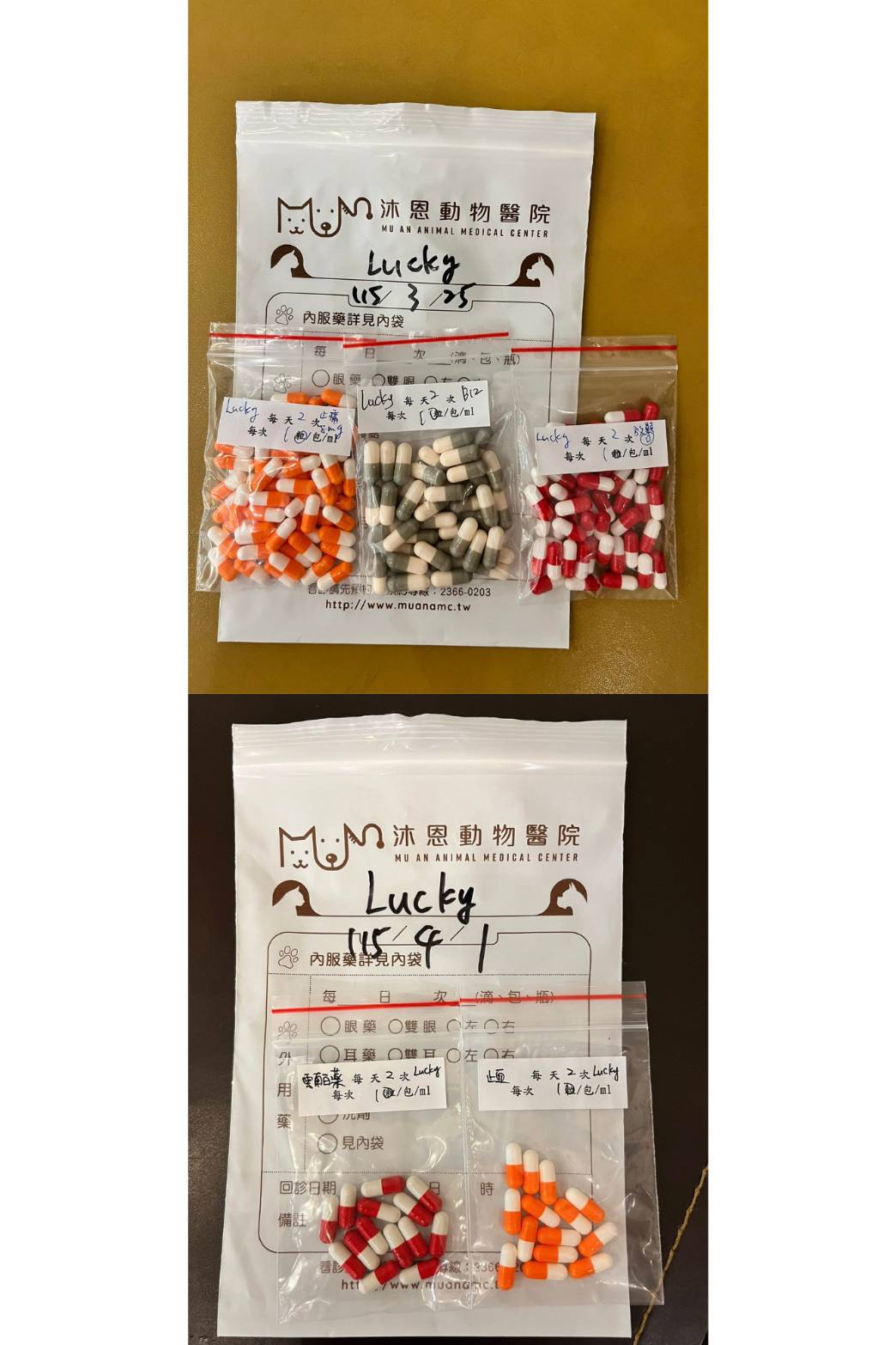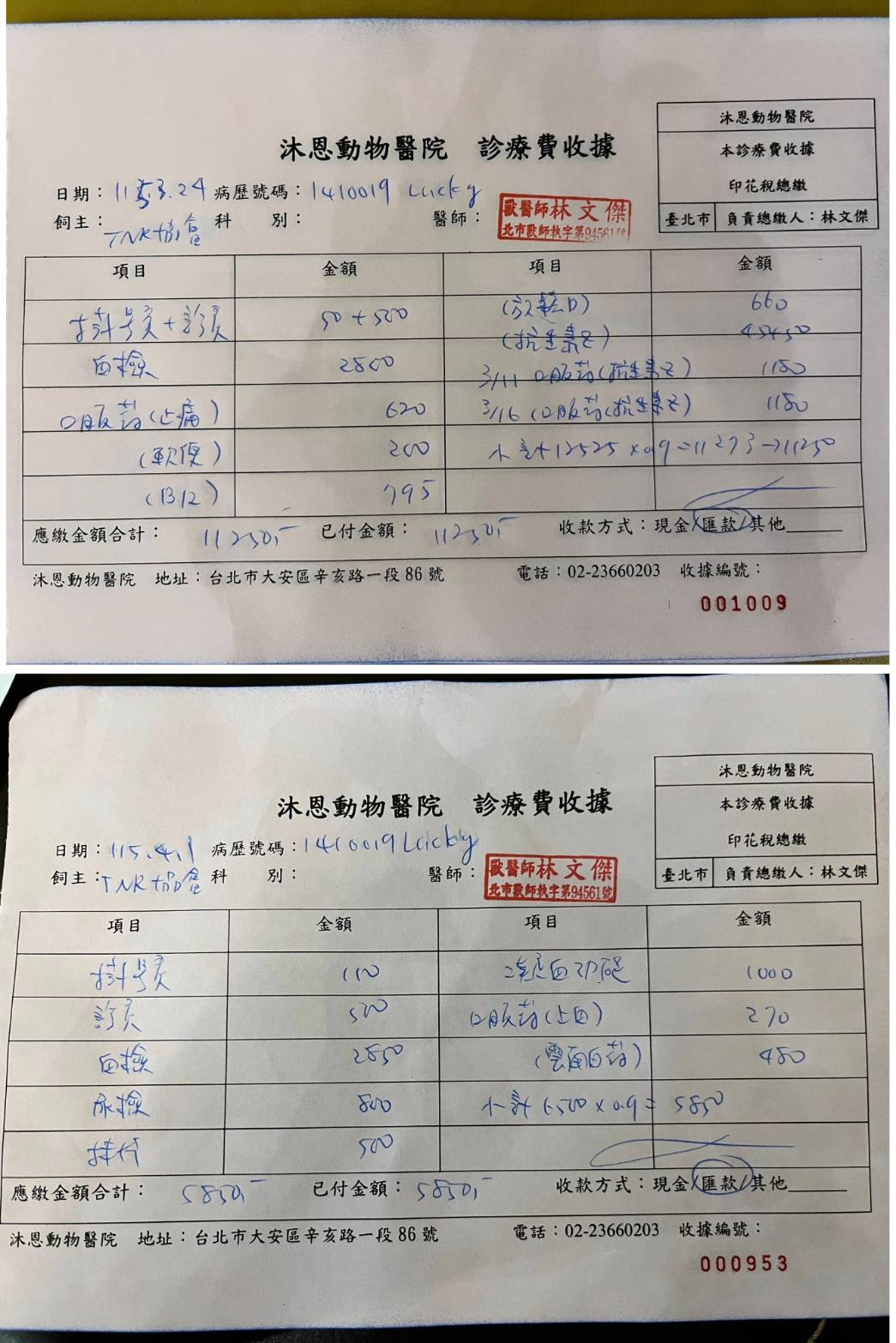 2026年3月24日於沐恩進行回診,尿檢檢查沒有太大問題,抗生素需要繼續吃,等停抗生素後才送尿液檢驗。因有抗生素治療皮膚有好轉比較髒再用紅藥水洗澡、平常清水擦澡即可,四益軟膏可停止使用。後於4月1日因一早發現Lucky再度血尿,於當日回沐恩就診,尿檢及血檢皆正常無細菌感染,醫師表示先儘量不幫Lucky擠尿便,除非沒有排尿腹脹,再換肚子朝上的方式輕壓腹部刺激,減少外力介入恢復。先開立止血用藥。本筆醫助為2026年3月24日至2026年4月1日於沐恩醫院的費用,包含看診,尿檢,血檢及用藥。