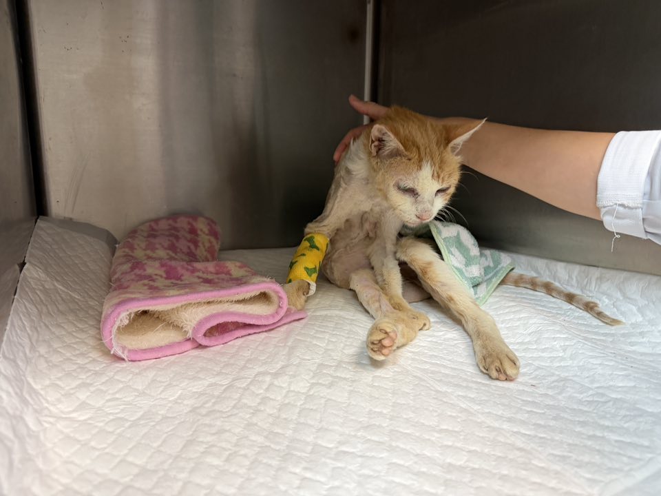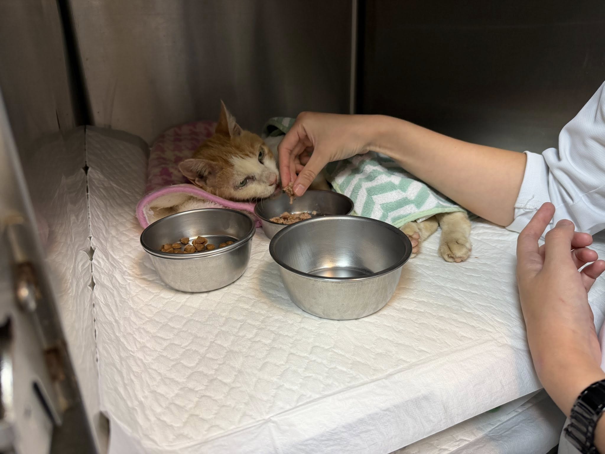 在院期間一日三餐,40-40-40g 雞肉泥或是罐頭,20-10-20g GI32 飼料,可將身體扶正自己會慢慢吃光。
