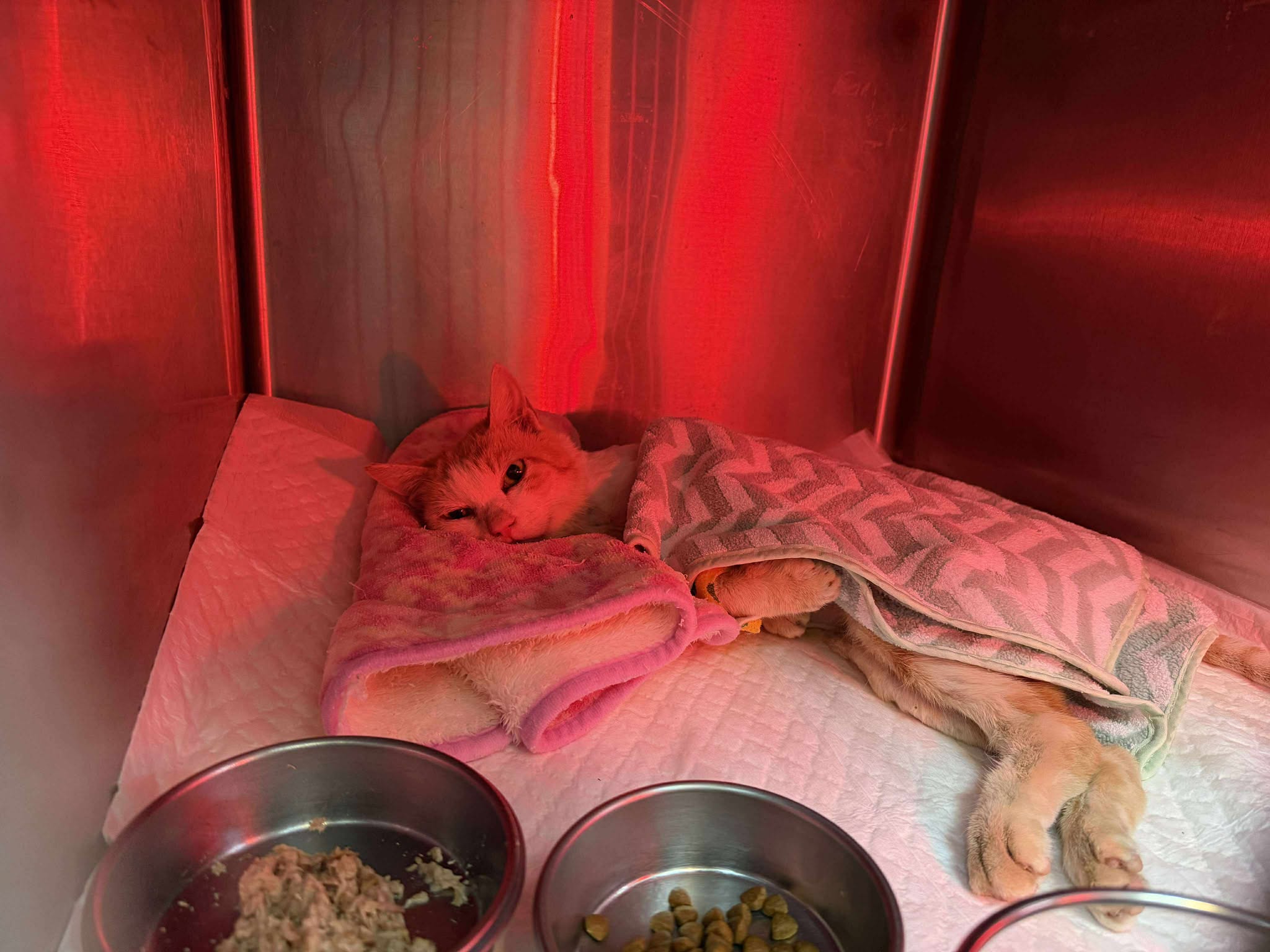 4. 保溫:住院期間四肢蓋毛巾體溫可以維持在38.5度左右,回協會可以視情況增加暖燈斜及暖包。(須注意暖燈不可直視眼睛!暖包小心燙傷!)