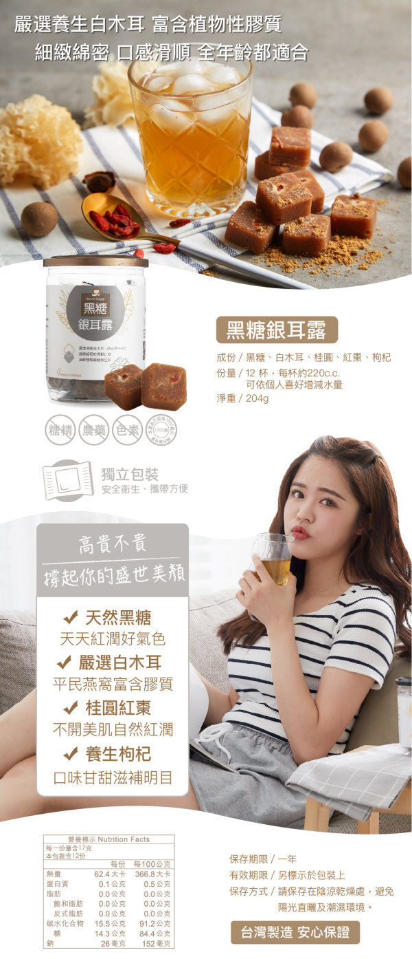 成份:黑糖、白木耳、桂圓、紅棗、枸杞