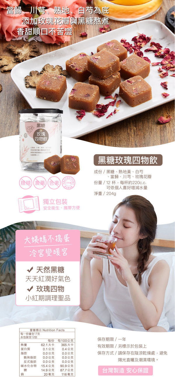 成份:黑糖、熟地黃、白芍、當歸、川芎、玫瑰花瓣