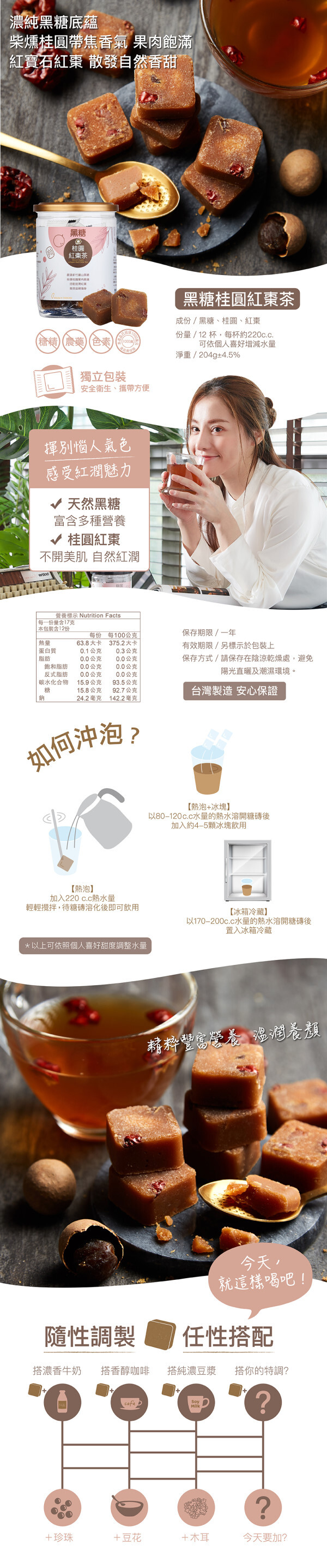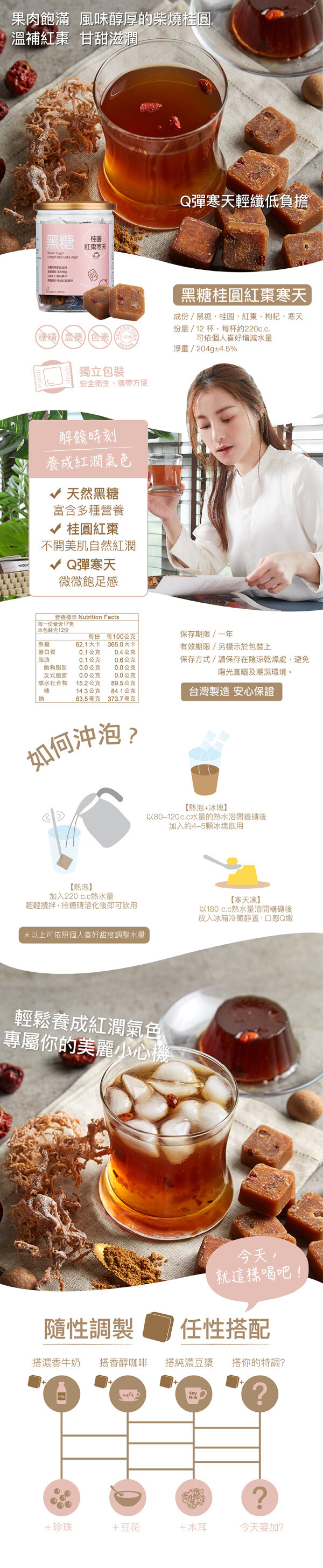 成份:黑糖、桂圓、紅棗、枸杞、寒天