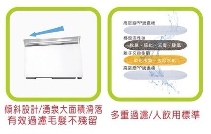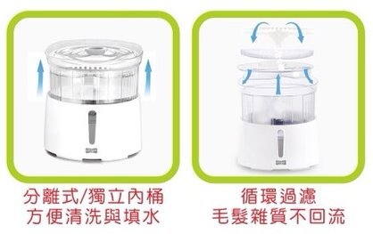 這款產品水有內、外桶分離,清潔的時後插頭及晶片不會碰到水,還有過濾的方式從上淋下循環才是真正的過濾、所以常常會看到其他品牌在店裏使用水是髒的。