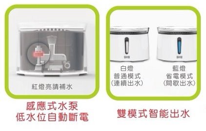 安全上:水少了會亮燈指示、水沒了會斷電、馬達無聲、電源是間斷式啟用、可省電。