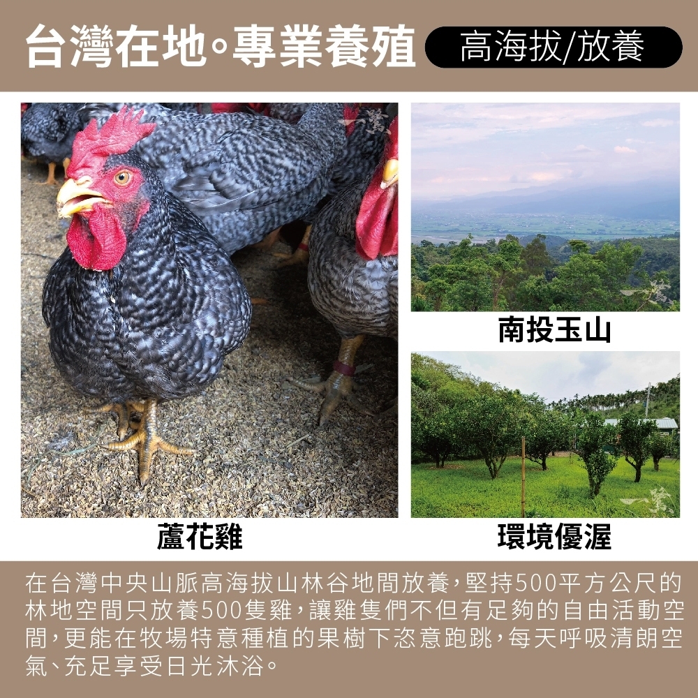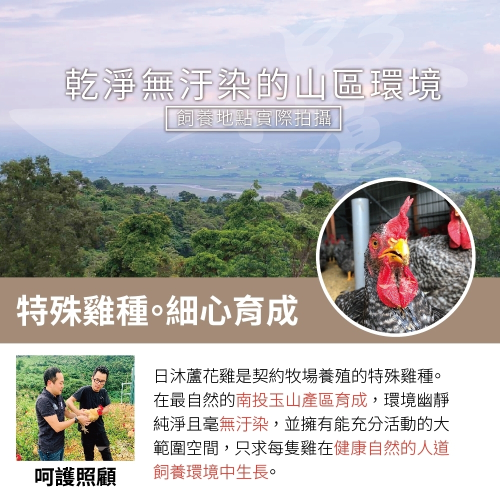 日沐蘆花雞是契約牧場養殖的特殊雞種,在最自然的南投玉山產區育成,環境幽靜、純淨且毫無汙染,並擁有能充分活動的大範圍空間,只求每隻雞在健康自然的人道飼養環境中生長。