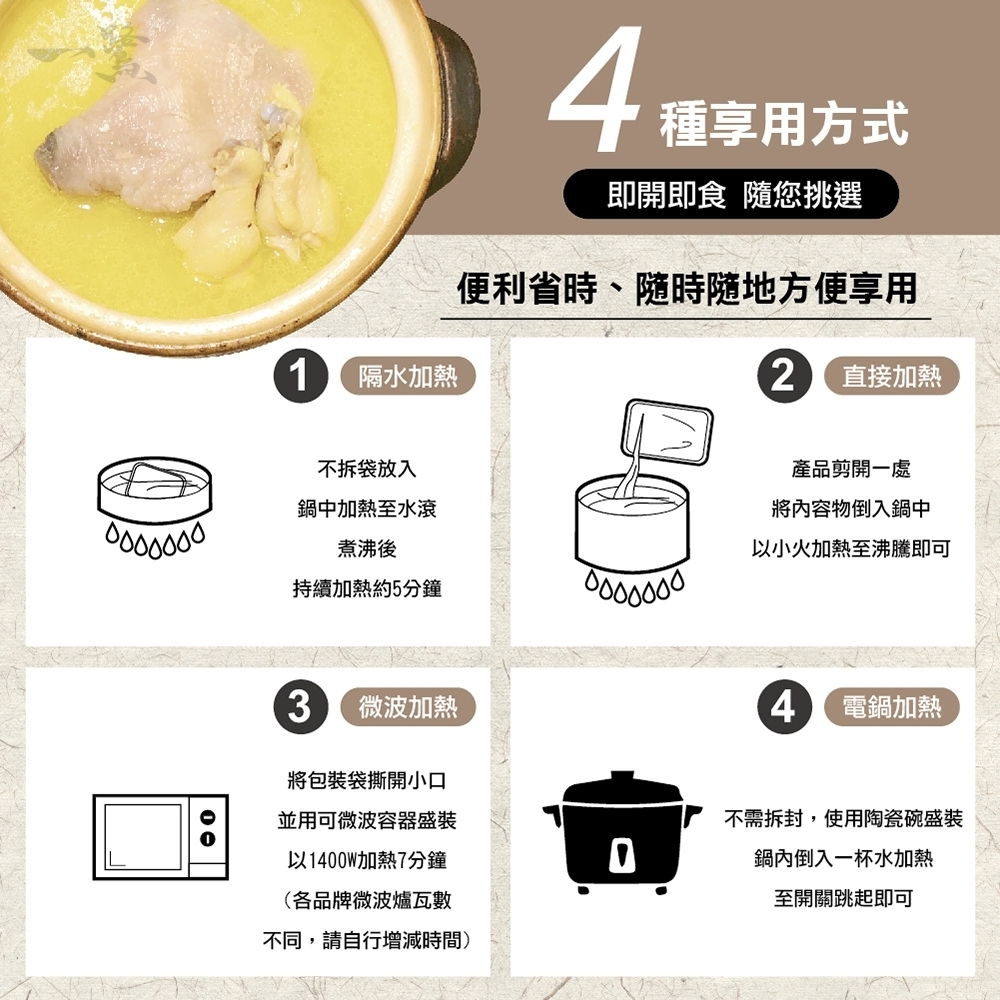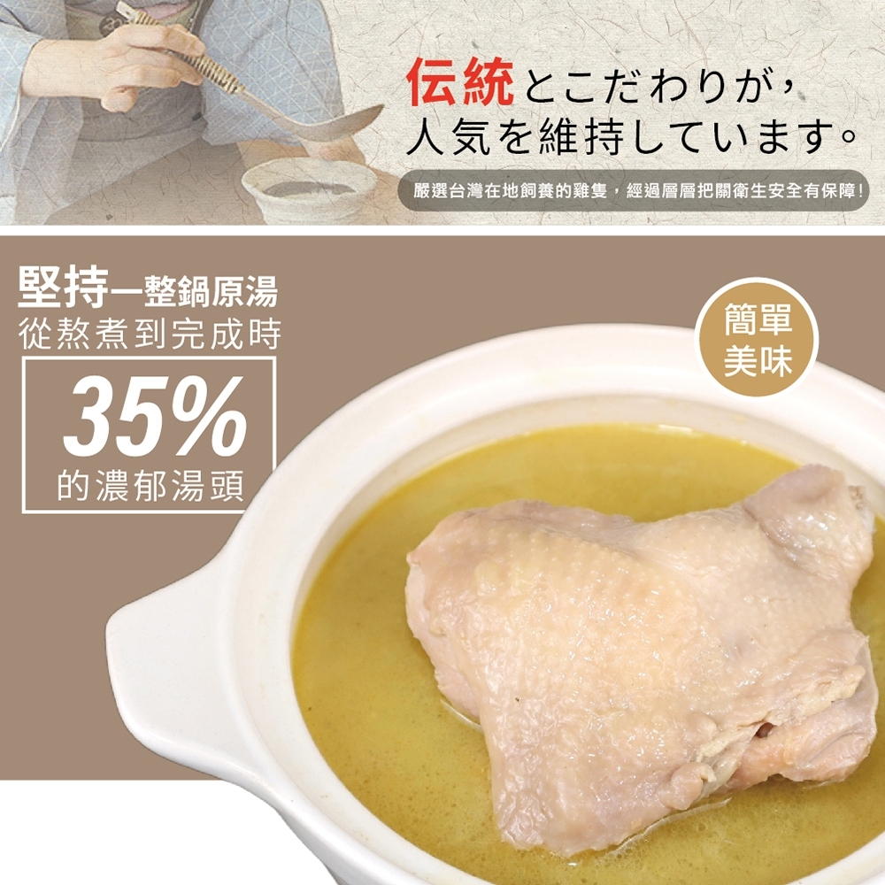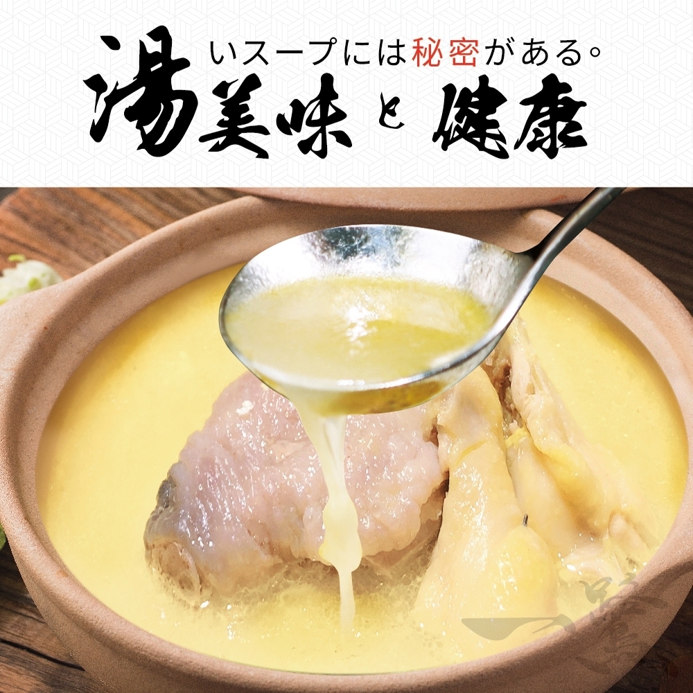 使用「日沐蘆花雞、粉紅雪鹽、水、等各式材料」並花費數小時以上來慢慢熬煮出的雞湯。要求整隻雞肉的甜味必須完整釋放。