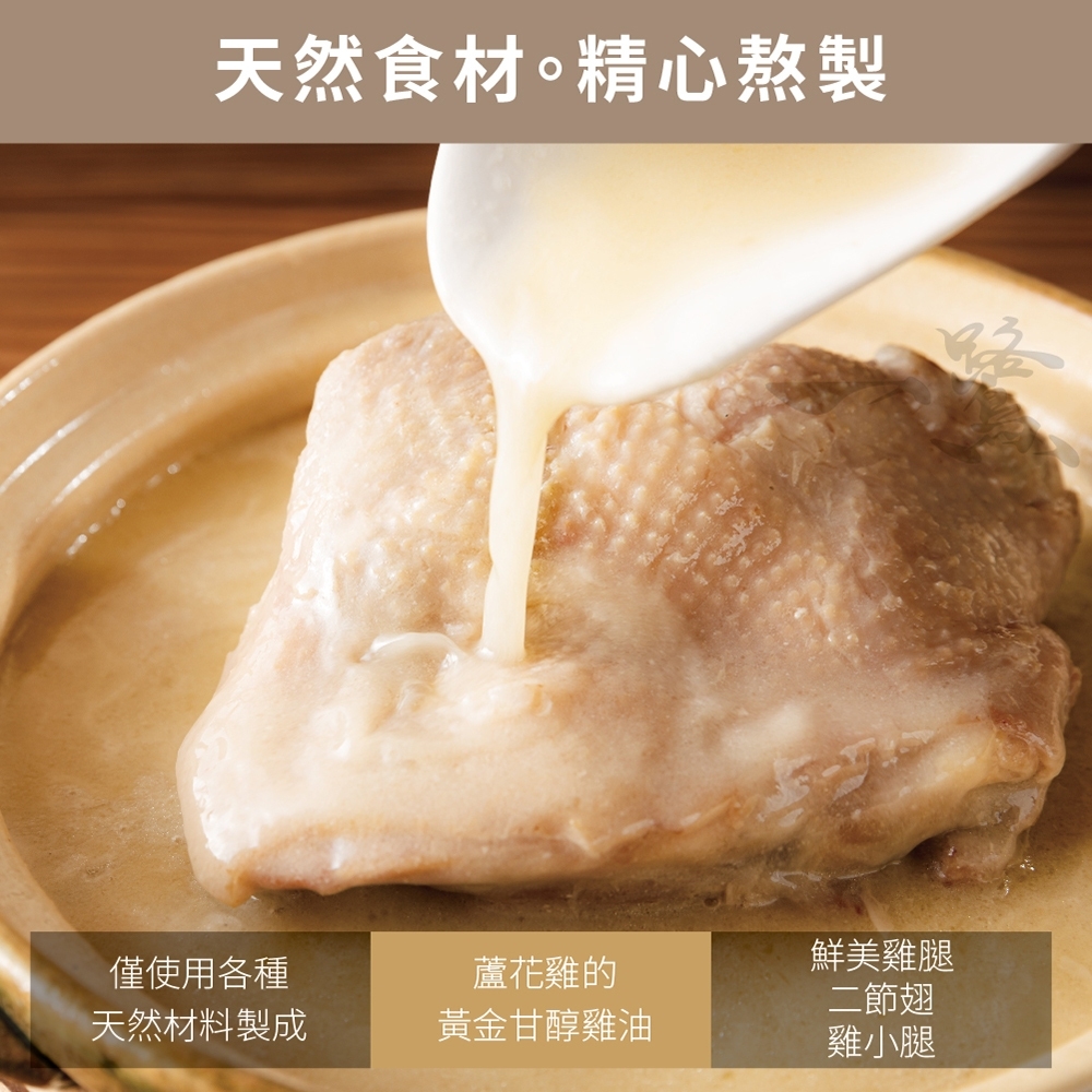 水、蘆花雞骨、蹄膀、雞腿塊、二節翅、翅小腿、老薑片、昆布、乾珠貝、粉紅雪鹽(喜馬拉雅岩鹽、大岩鹽、天然岩鹽、清酒)、全脂乳、糖。