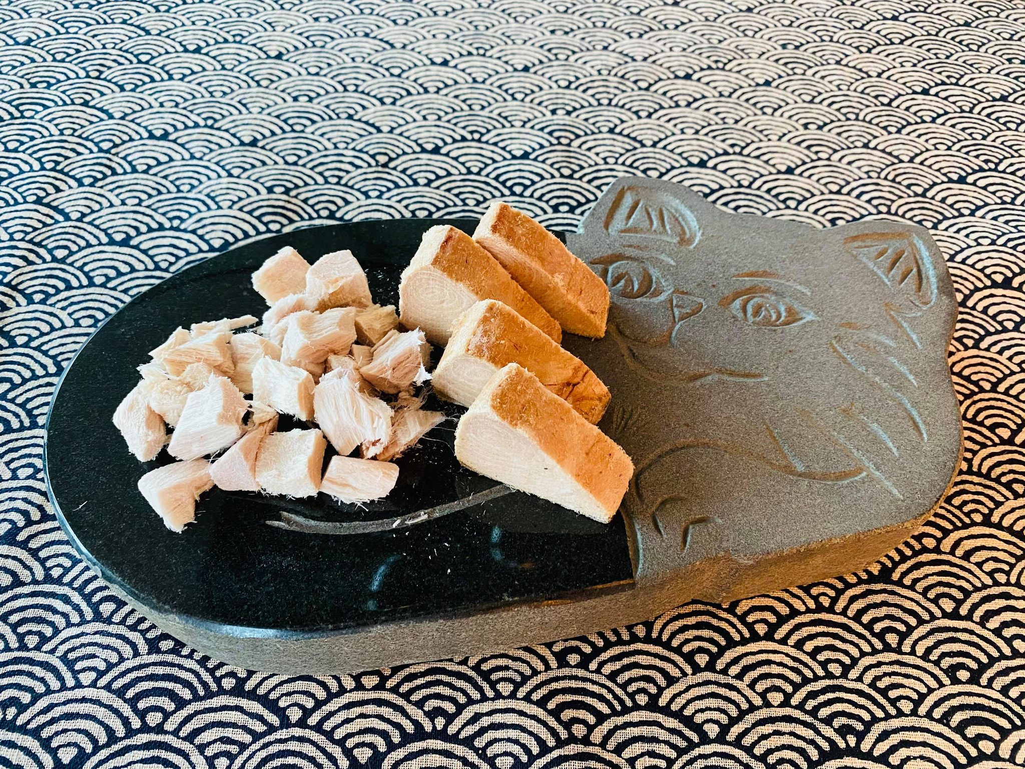 1.請注意純肉塊需泡水、或是捏碎與剪小塊餵食,避免貓咪食用過快,忽略咀嚼而嘔吐。