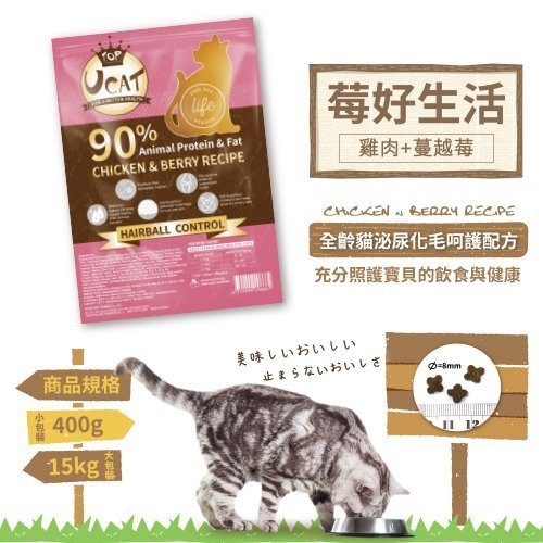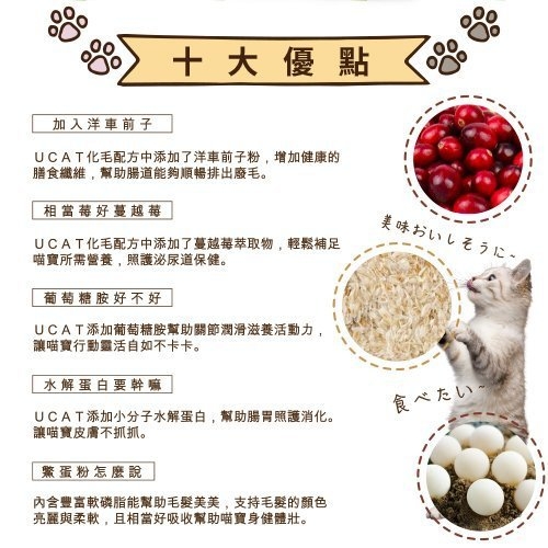 UCAT化毛配方中添加了蔓越莓萃取物,輕鬆補足喵寶所需營養,照護泌尿道保健。