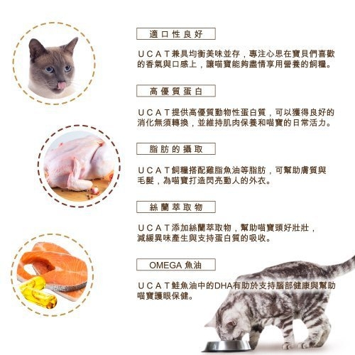 UCAT提供高優質動物性蛋白質,可以獲得良好的消化無須轉換,並維持肌肉保養和喵寶的日常活力。