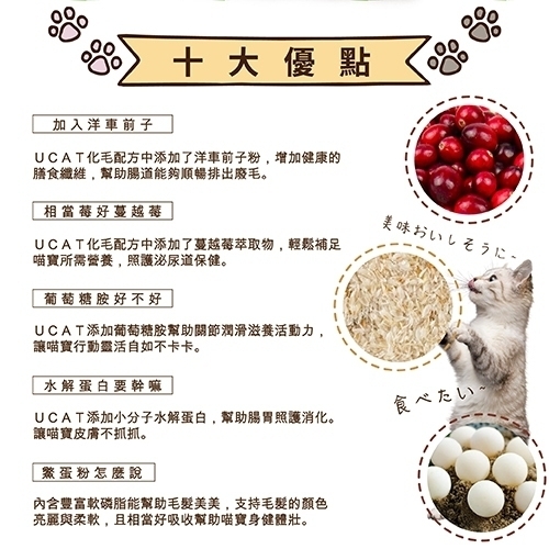 UCAT化毛配方中添加了蔓越莓萃取物,輕鬆補足喵寶所需營養,照護泌尿道保健。