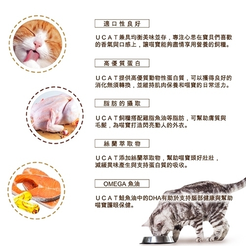 UCAT添加小分子水解蛋白,幫助腸胃照護消化。讓喵寶皮膚不抓抓。