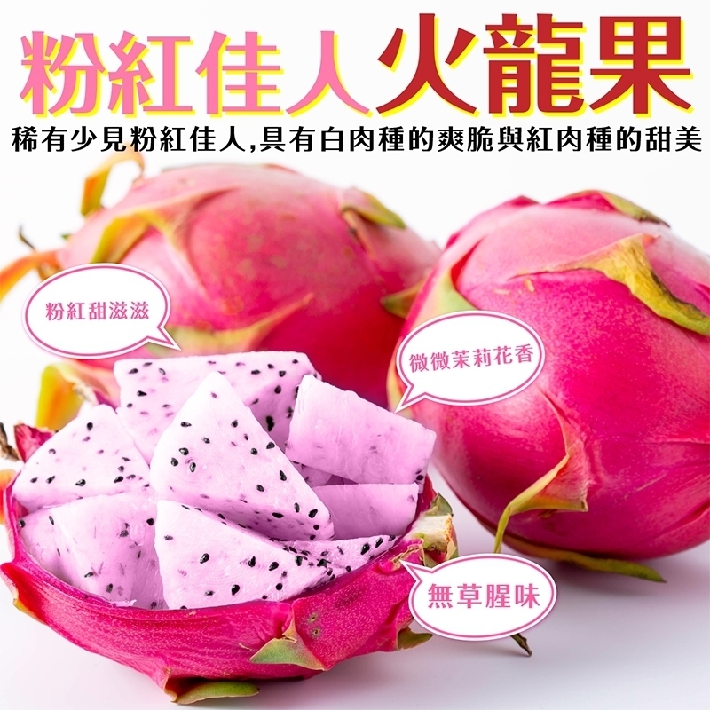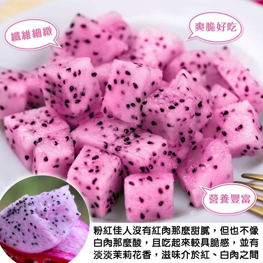 粉紅佳人的火龍果,它是由白肉與紅肉種雜交選育而成,外觀綠色的萼片較長,果肉呈現奇特的粉紅色,同時具有白肉種的爽脆與紅肉種的甜美,無草腥味之外還帶有淡淡的茉莉花香,目前市面上相當少見唷!