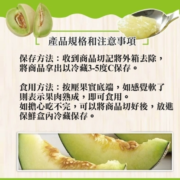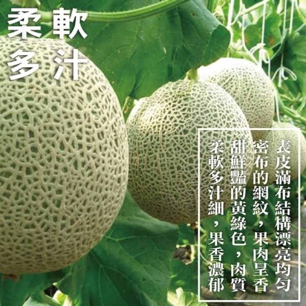果面網紋立體且細密均勻,果肉顏色為黃綠色,果肉厚實、口感細緻軟嫩、香氣撲鼻,是送禮最佳選擇~