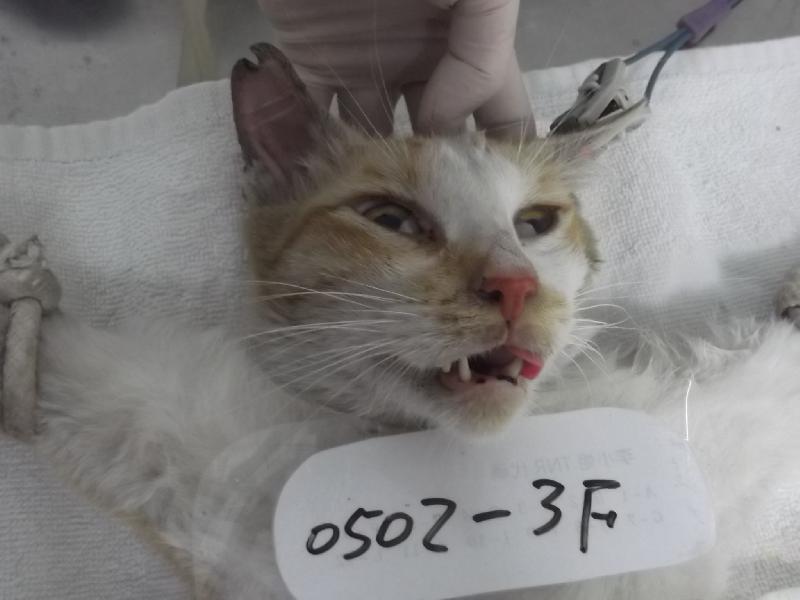 這邊看到約有5隻母貓都在哺乳了, 需等小貓斷奶才能紮, 先抓公貓和其它沒在哺乳的母貓. 此貓有嚴重口炎並且有腹水, 移至醫助申請0502-3F