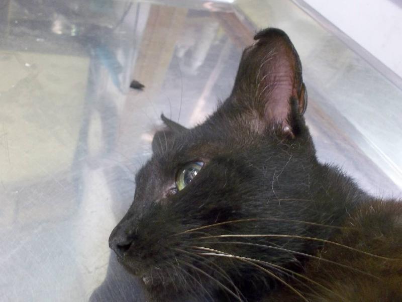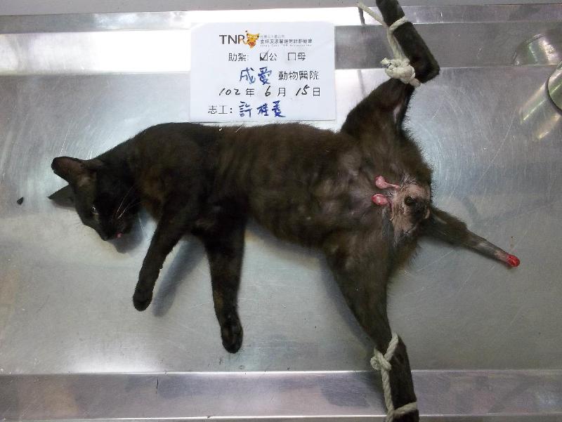原本是要救援皮膚病嚴重的黑貓,反而誘捕到此公黑貓,且尾巴頂端也受傷,進行結育也順便治療傷口!