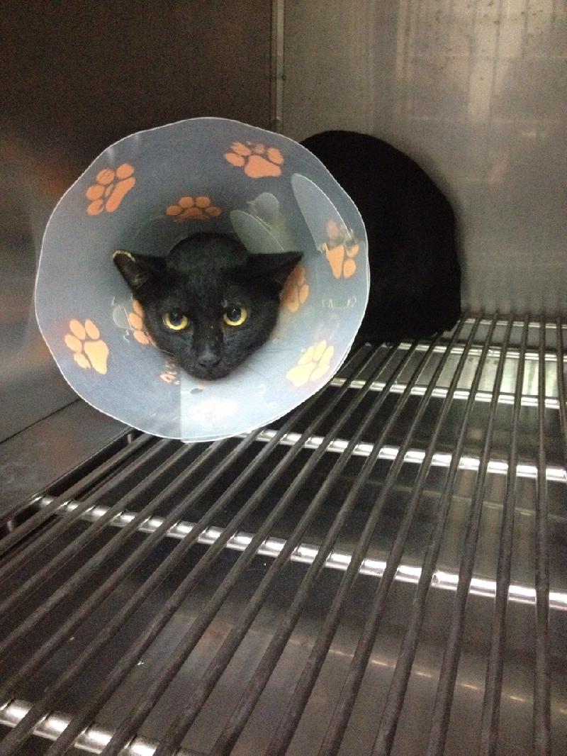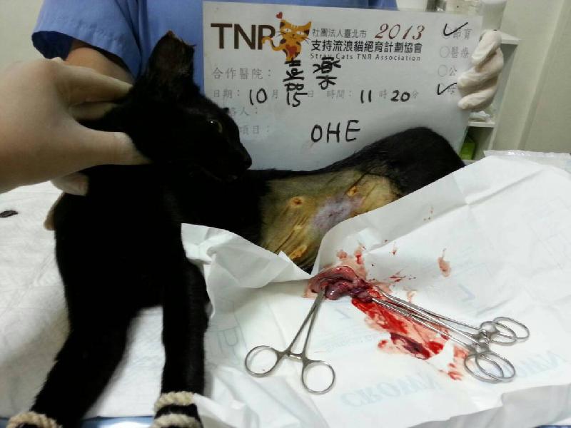 有人固定餵養的黑母貓,抓到時已懷有身孕,安排待產,後貓媽可能太緊張生產時未將胎模撕開小貓全數死亡,結紮原放後會繼續餵養。