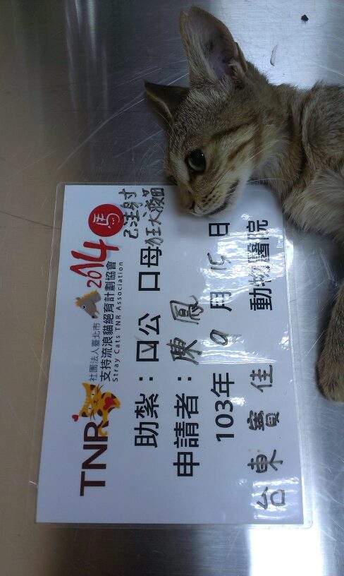 此貓是我餵養區域的浪浪,還算乖巧,不貪吃,但抓他又彈開,還是得罐罐侍候,才可順利誘捕,雖是公貓,但已處於類似發情狀態,頻頻聞母貓..,所以不抓不行,此貓有打狂犬病疫苗,謝謝協會的幫忙,更謝謝各界善心人士的捐助,感恩大家~